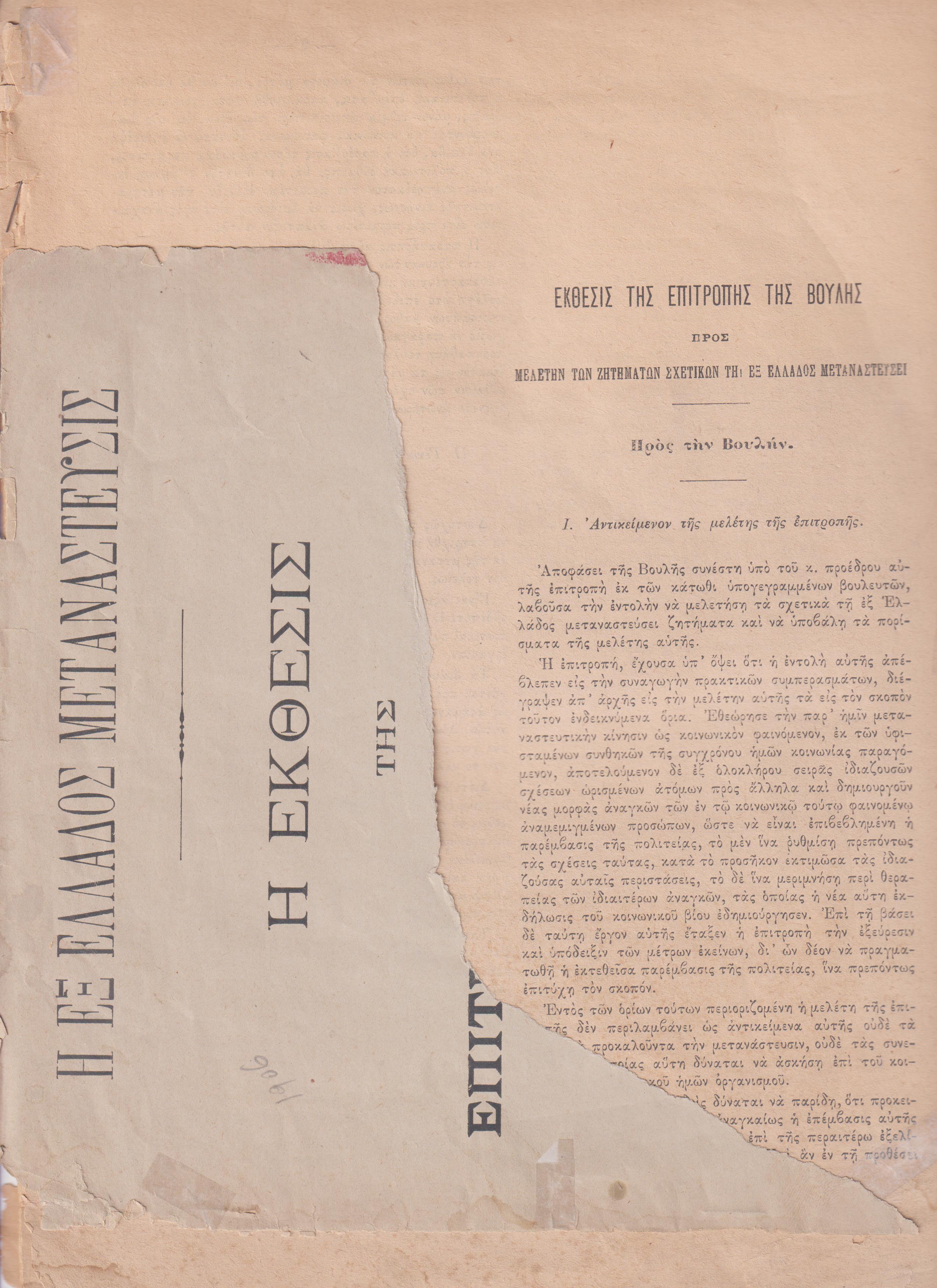 ΄Εκθεσις της Επιτροπής της Βουλής προς μελέτην των ζητημάτων σχετικών. [ Εν Αθήναις 1906], 4ο, σελ. 56 ( Ο τίτλος στο εξώφυλλο το μεγαλύτερο μέρος του οποίου λείπει, είναι : Η ΕΞ ΕΛΛΑΔΟΣ ΜΕΤΑΝΑΣΤΕΥΣΙΣ . Η ΄Εκθεσις της Επιτροπής της Βουλής και η σχετική πρότασις. Εν Αθήναις 1906, ΤΥΠΟΓΡΑΦΕΙΟΝ ΡΑΦΤΑΝΗ, 4ο, σελ. 56 , βλ. ΕΘΝΙΚΗ ΒΙΒΛΙΟΘΗΚΗ, αντίτυπο ταλαιπωρημένο, λυτό, το χαρτί «καμμένο» λόγω πολυκαιρίας & ποιότητας & θριμματίζεται εύκολα)