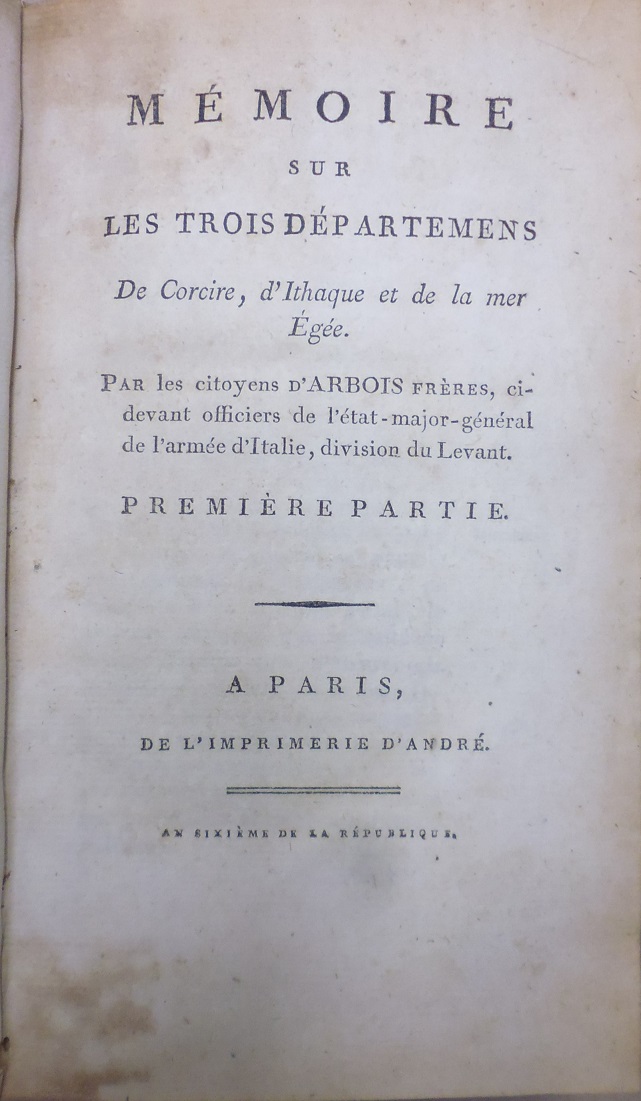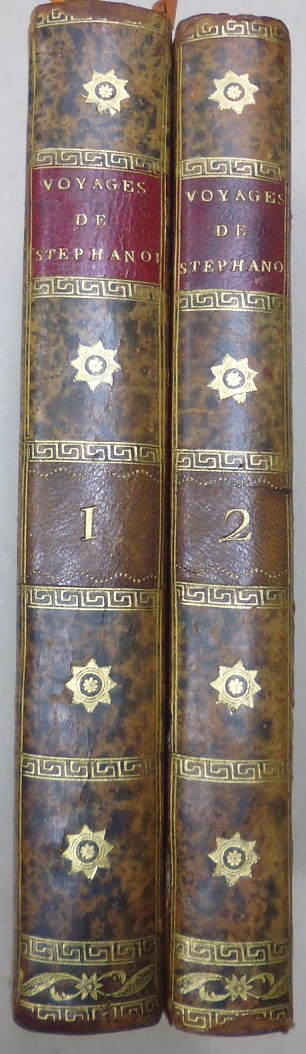 STEPHANOPOLI DEMO ET NICOLO, Voyage en Grèce, pendant les années 1797 et 1798, t. 1-2. D’après deux missions, dont l’une du Gouvernement français, et l’autre du général en chef Buonaparte. Rédigé par un des Professeurs du Prytanée. Avec figures, plans et vues levés sur les lieux. A Londres 1800, 8ο, τόμος Α΄ σελ. XVI+303+7εικ. εκτός κειμένου(εκ των οποίων οι 2 αναδιπλούμενες) , τόμος Β΄ σ. 4χ.α.+319+1λ. ( 2 τόμοι δεμένοι, βιβλιοδεσία εποχής. Στον πρώτο τόμο μπροστά δεμένο μαζί : Mémoire sur les trois départemens De Corcire, d’Ithaque et de la mer Egée Par les citoyens D’ ARBOIS FRERES, cidevant officiers de l’état-major-général de l’armée d’Italie, division du Levant part.1-2 . A Paris, DE L’ IMPRIMERIE D’ ANDRE. 1897, 8o, σελ. 104 (αντίτυπο σε πολύ καλή κατάσταση)