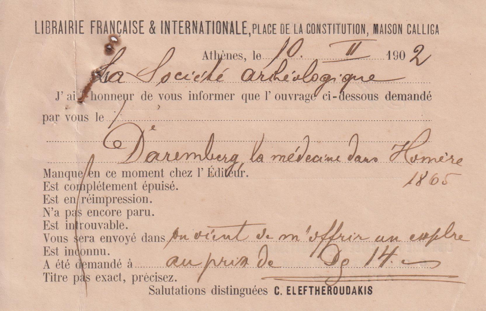 ΕΛΕΥΘΕΡΟΥΔΑΚΗΣ ΚΑΙ CHARLES BECK. Χειρόγραφα σημειώματα των διεθνών βιβλιοπωλείων Ελευθερουδάκη και Charles Beck για παραγγελίες βιβλίων από την Αρχαιολογική Εταιρεία. Αθήνα 10 Φεβρουαρίου 1902 και 21 Αυγούστου 1904. (Σύνολο 3 τεκμήρια)