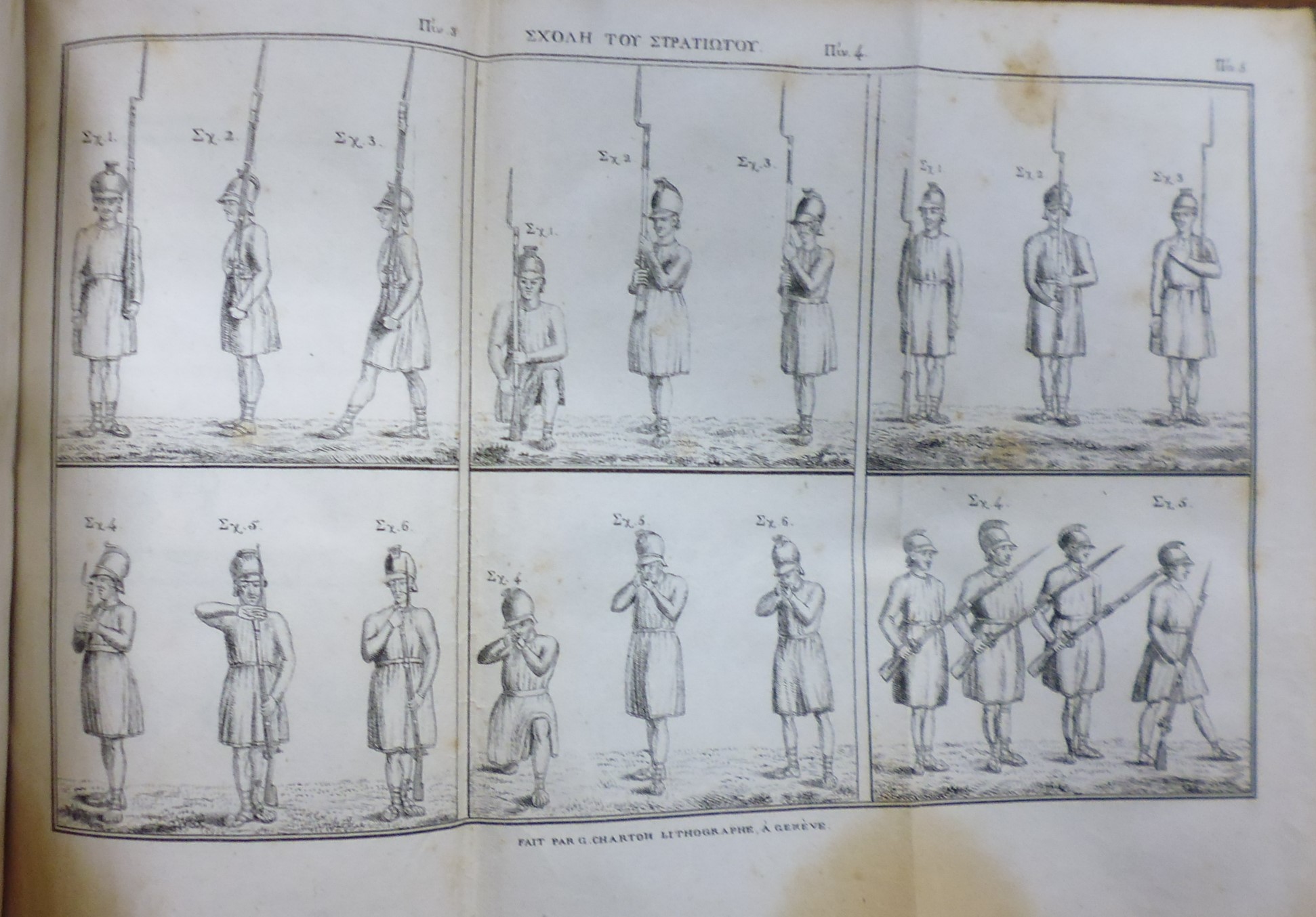 ΚΑΝΩΝΙΚΗ Περιέχουσα την Γυμναστικήν και Πρακτικήν του Πεζικού Στρατεύματος, Μεταφρασθείσα εκ του γαλλικού εις την γραικικήν γλώσσαν, Παρά Χ. ΝΙΚΟΛΑΪΔΟΥ, Ανδριανοπολίτου. Εν Γενεύη της Ελβετίας, ΕΚ ΤΗΣ ΤΥΠΟΓΡΑΦΙΑΣ Π. Α. ΒΟΝΝΑΝΤΟΥ, 1824, 8ο, σελ. 6χ.α.+494+VIII (ΗΛΙΟΥ αρ. 1824.32, προγενέστερη βιβλιογρ. ΓΚΙΝΗΣ-ΜΕΞΑΣ αρ. 1435). (2) Πίνακες αναφερόμενοι εις την Κανωνικήν περιέχουσαν την Γυμναστική και Πρακτικήν του Πεζικού Στρατεύματος, Μεταφρασθείσα εκ του γαλλικού εις την γραικικήν γλώσσαν, Παρά Χ. ΝΙΚΟΛΑΪΔΟΥ, Ανδριανοπολίτου. Εν Γενεύη της Ελβετίας, ΕΚ ΤΗΣ ΤΥΠΟΓΡΑΦΙΑΣ Π. Α. ΒΟΝΝΑΝΤΟΥ, 1824, 8ο, σελ. φ.1+54+2λ+40πτ.πιν. σε 38φ. στο τέλος του τόμου, αριθμημμένοι 1-39 (ο αρ. 11 επαναλαμβάνεται δύο φορές). (ΗΛΙΟΥ αρ. 1824.51, προγενέστερη βιβλιογρ. ΓΚΙΝΗΣ-ΜΕΞΑΣ αρ. 1452). Και τα δύο έργα δεμένα σ’ ένα τόμο, βιβλιοδεσία εποχής, κατάσταση αντιτύπου αρκετά καλή. Στον 1ο τόμο επαναλαμβάνονται οι σελίδες 425-432 )
