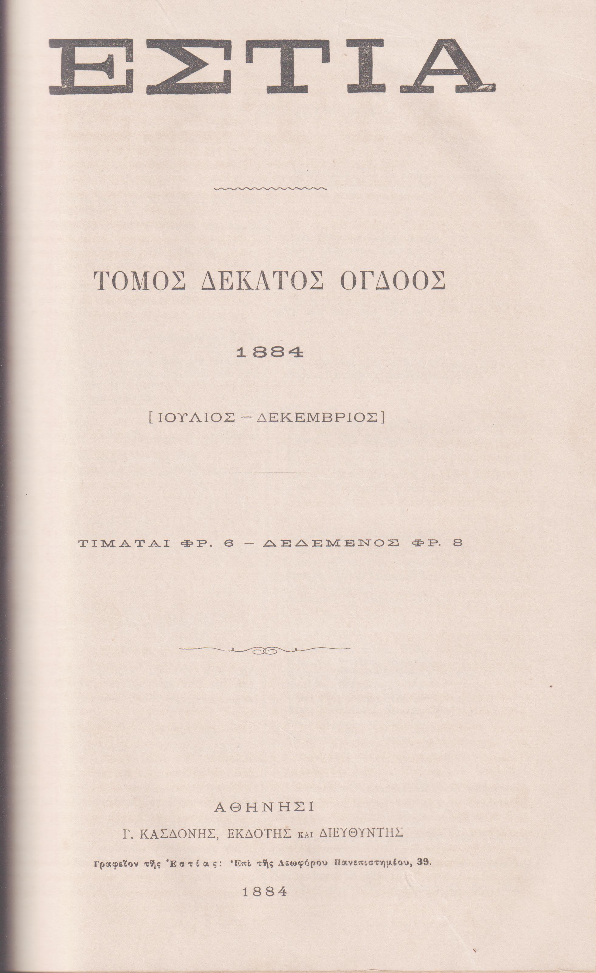 ΕΣΤΙΑ , έτος Θ΄,  τόμοι 17ος -18ος , [Ιανουάριος-Δεκέμβριος 1884], Εκδίδοται κατά Κυριακήν . Γ. Κασδόνης, Εκδότης και Διευθυντής. Αθήνησι 1884, 4ο, σελ. 4χ.α.+412+4χ.α.+413-828+1εικ.εκτός κειμένου ( Τόμος 17ος , τεύχη αρ. 418[1 Ιανουαρίου 1884], έως αρ. 443[ 24 Ιουνίου 1884], σελ. 4χ.α.+412. Τόμος 18ος, τεύχη αρ. 444[1 Ιουλίου 1884] – αρ. 469[23 Δεκεμβρίου 1884], σελ. 4χ.α.+413-828). Οι δύο τόμοι πλήρεις δεμένοι,  σ’ ένα τόμο, ιδιωτική βιβλιοδεσία ταλαιπωρημένη, η ράχη της βιβλιοδεσίας αποκολλημένη από το μπροστινό καπάκι. Το κείμενο σε αρκετά καλή κατάσταση.