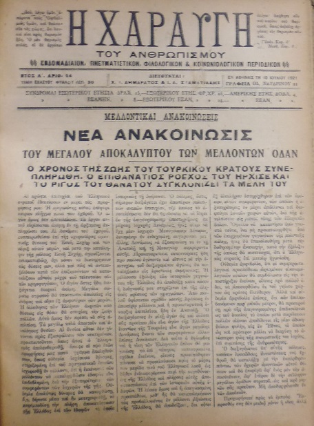 ΧΑΡΑΥΓΗ [Η] ΤΟΥ ΑΝΘΡΩΠΙΣΜΟΥ, έτη Α΄-Δ΄(1921-1924), Εβδομαδιαίον πνευματικόν, φιλολογικόν, και κοινωνιολογικόν περιοδικόν