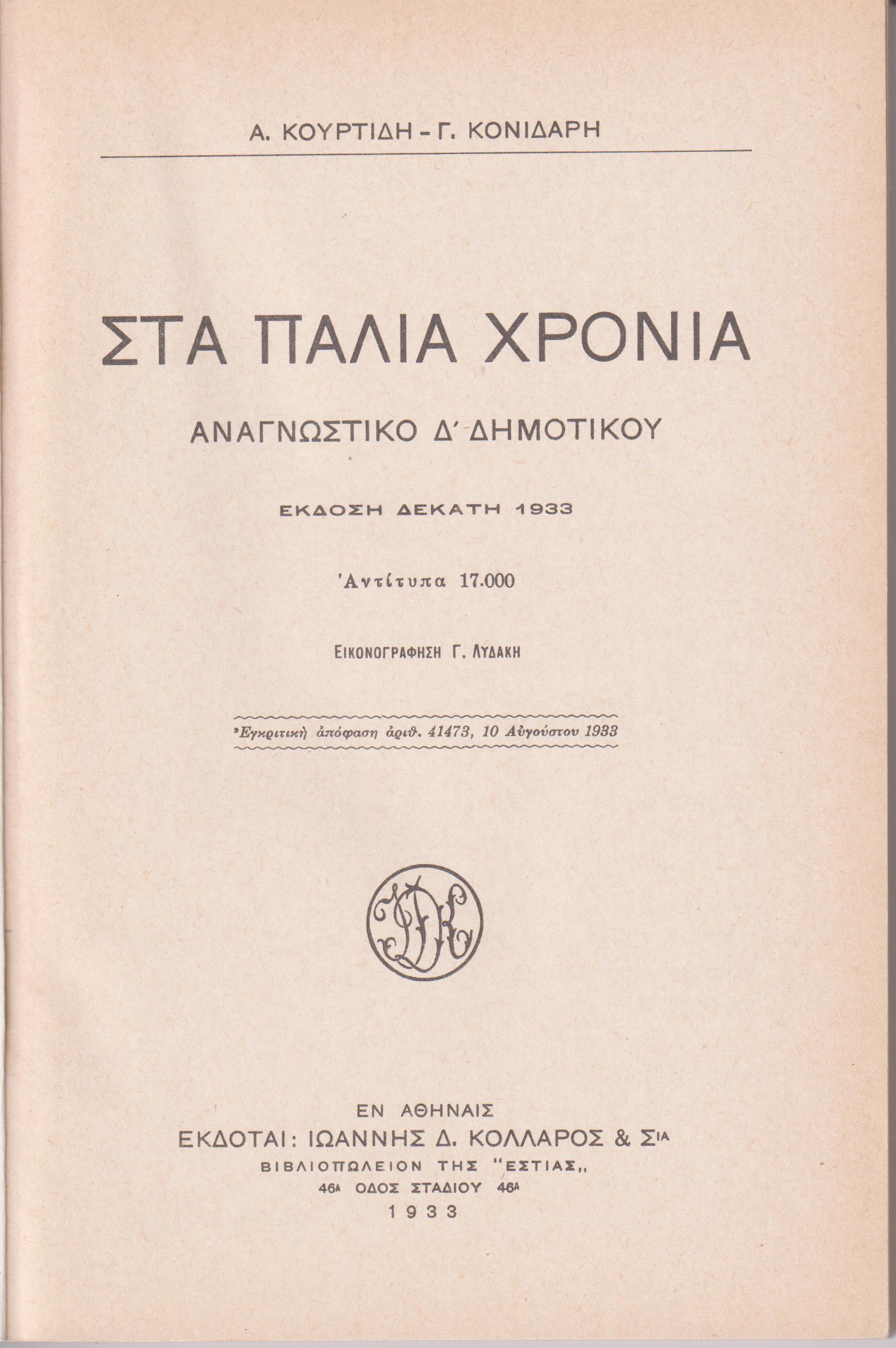 ΚΟΥΡΤΙΔΗΣ Α. - ΚΟΝΙΔΑΡΗΣ Γ., Στα παλιά χρόνια, αναγνωστικόν Δ' Δημοτικού. ΄Εκδοση 10η. Εικονογράφηση Γ. Λυδάκη. Εν Αθήναις 1933, 8ο, σελ. 208