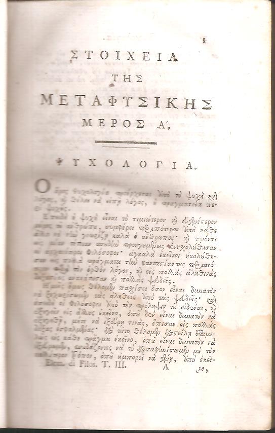 ΣΟΑΥΙΟΣ ΦΡΑΓΓΙΣΚΟΣ (SOAVE FRANCESCO), Στοιχεία της Λογικής, Μεταφυσικής και Ηθικής. Τόμος Γ΄. Μεταφρασθέντα μεν εις την ημετέραν Διάλεκτον παρά Γρηγορίου Ιεοροδιακόνου Κωνσταντά του Μηλιώτου. Ενετίησιν, Παρά Νικολάω Γλυκεί τω εξ Ιωαννίνων, 1804, 8ο, σελ. 12+336 (βιβλιοδεσία εποχής, μειονεκτήματα: βιβλιοδεσία ταλαιπωρημένη, ίχνη υγρασίας στο κάτω μέρος στις πρώτες 50 σελίδες, σητόβρωτο[τρύπες] στο κάτω περιθώριο από σελ. 221-τέλος, ΗΛΙΟΥ αρ. 1804.71, ΓΚΙΝΗΣ-ΜΕΞΑΣ αρ. 298, στον ψευδότιτλο: Στοιχεία της Φιλοσοφίας. Τόμος Γ΄)