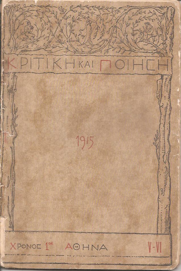 ΚΡΙΤΙΚΗ ΚΑΙ ΠΟΙΗΣΗ 1915-1919, Μηνιαία έκδοση. Αθήνα, ΤΥΠΟΓΡΑΦΕΙΟ Η. ΠΑΠΑΠΑΥΛΟΥ, 1915-1919, 8ο, ( Διαθέτουμε τα τεύχη : Χρόνος 1ος (1915-1919), αρ. Ι[Μάρτης 1915], σ. 36, από το 2ο τεύχος[ΤΥΠΟΓΡΑΦΕΙΟ ΑΘΑΝ. ΠΑΠΑΣΠΥΡΟΥ], αρ. ΙΙ[Απρίλης 1915], σ. 37-68(λείπει οπισθόφυλλο), αρ. ΙΙΙ[Μάης 1915], σ. 69-106, αρ. IV[Ιούνιος 1915], σ. 107-130, αρ. V-VI[Αύγουστος-Σεπτέβριος 1915], σ. 131-168+2χ.α., το τεύχος VII λείπει, αρ. VIII-IX[Σεπτέβρης-Οχτώβρης 1916], σ. 209-278, αρ. X-XII[Ιούλιος 1919], σ. 279-390+4[περιεχόμενα του Α΄τόμου Μάρτης 1915-Ιούλιος 1919). Περιεχόμενα: τεύχος αρ. Ι. Σ. Αλιμπέρτης: Εμμ. Ροΐδης – Εσσαί. – Τρουβέρος: Η ιστορία του Τριστάνου και της Υζέτας (από τα γαλλικά). – Σ. Α.: Πολιτικό Δελτίο. – Γ. Μ. Αποστολάκης: Ο Βίος του Θωμά Καρλάϊλ – Ι : Η Δοκιμασία. – τεύχος αρ. ΙΙ. Dante Gabriel Rosseti: Λιλίθ. – Γι. Μ. Αποστολάκης: Ο Βίος του Θωμά Καρλάϊλ – ΙΙ: Η γνωριμία με το Γκαίτε. – Τρουβέρος: Η ιστορία του Τριστάνου και της Υζέτας. Μυστικός: Παραλλαγές. – Σ. Αλιμπέρτης: Εμμ. Ροΐδης – Εσσαί. – Έσπερος: Τα δέντρα και το Αττικό τοπείο. – Κριτική: Βιβλιογραφία. – τεύχος αρ. ΙΙΙ. Γι. Μ. Αποστολάκης: Ο Βίος του Θωμά Καρλάϊλ – ΙΙΙ: ΣτηνΕρημιά. – Τρουβέρος: Η ιστορία του Τριστάνου και της Υζέτας. – Σ. Αλιμπέρτης: Για το σημερινό Πόλεμο. – τεύχος αρ. IV. Σ. Αλιμπέρτης: Η ΄Εκδοση των έργων του Μαβίλη. – Τρουβέρος: Η ιστορία του Τριστάνου και της Υζέτας. – Γι. Μ. Αποστολάκης: Ο Βίος του Θωμά Καρλάϊλ – ΙV: Δόξα. – Θεατρική κίνηση. – τεύχος αρ. V-VI. Γι. Μ. Αποστολάκης: Ο Βίος του Θωμά Καρλάϊλ – V: Φλυαρίες. – VI: Η Γερμανία. – Walter Pater: Sandro Botticelli. – Σ. Αλιμπέρτης: Εξ αφορμής μιάς συλλογής στίχων. – ⁂ Κριτικές Πενιές. – τεύχος αρ. VIII-IX. Novalis: ΄Υμνοι στη Νύχτα. – ΄Αλ. Μπουρνιά: Παραλλαγές. – Γι. Αποστολάκη: ΄Ενας φιλολογικός πρόγονος – Γιάννης Καμπύσης. – J. Michelet: Η Μανόν Λεσκό – Ο θάνατος του Βαττώ. – Κριτικές πενιές. – τεύχος αρ. X-XII: Γκαίτε: Οι σπουδές του Γουλιέλμου Μαΐστερ. – Γιάν. Αποστολάκη: Η κριτική. – Νίτσε: Η αρχαία Ελληνική Πολιτεία. – Σπ. Αλιμπέρτη: Ιάκωβος Πολυλάς. – Γιαν. Αποστολάκη: Μία Προσθήκη. – Θεατρική Κίνηση. – Κριτικές πενιές. (Το τελευταίο τεύχος X-XII τυπώθηκε στο τυπογραφείο ΠΑΡΑΣΚΕΥΑ ΛΕΩΝΗ και είναι σητόβρωτο στα εξωτερικά περιθώρια στις πρώτες σελίδες). Λείπει το τεύχος VII(7) για να είναι πλήρης σειρά.