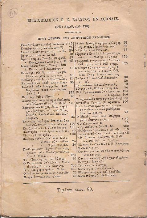 ΔΡΑΪΚΗΣ ΙΩΑΝΝΗΣ, Στοιχειώδης Γεωγραφία, συνταχθείσα υπό Ιωάννου Δραΐκη. Πρός χρήσιν των Δημοτικών Σχολείων. Εν Αθήναις, ΠΑΡΑ ΤΩ ΕΚΔΟΤΗ Σ. Κ. ΒΛΑΣΤΩ, 1878, 16ο, σελ. 60 (σπάνιο, ΗΛΙΟΥ-ΠΟΛΕΜΗ αρ, 1878.622)