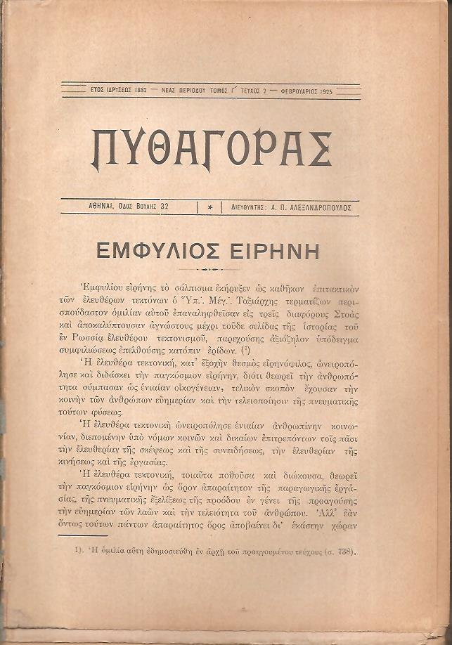 «ΠΥΘΑΓΟΡΑΣ» Νέα περίοδος, τόμος Γ΄, 1925, τεύχη 1-12. Περιοδικόν Ε∴ Τ∴ Εκδιδόμενον εν Αθήναις κατά μήνα. Ιδρυτής Εμμανουήλ Γαλάνης, Διευθυντής Α. Αλεξανδρόπουλος. Εν Αθήναις 1925, 8ο, σελ. [737]-1104 (άκοπα φύλλα, πλήρης τόμος χωρίς εξώφυλλα)