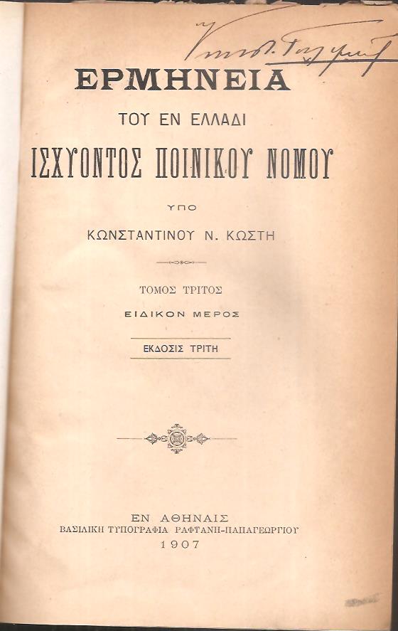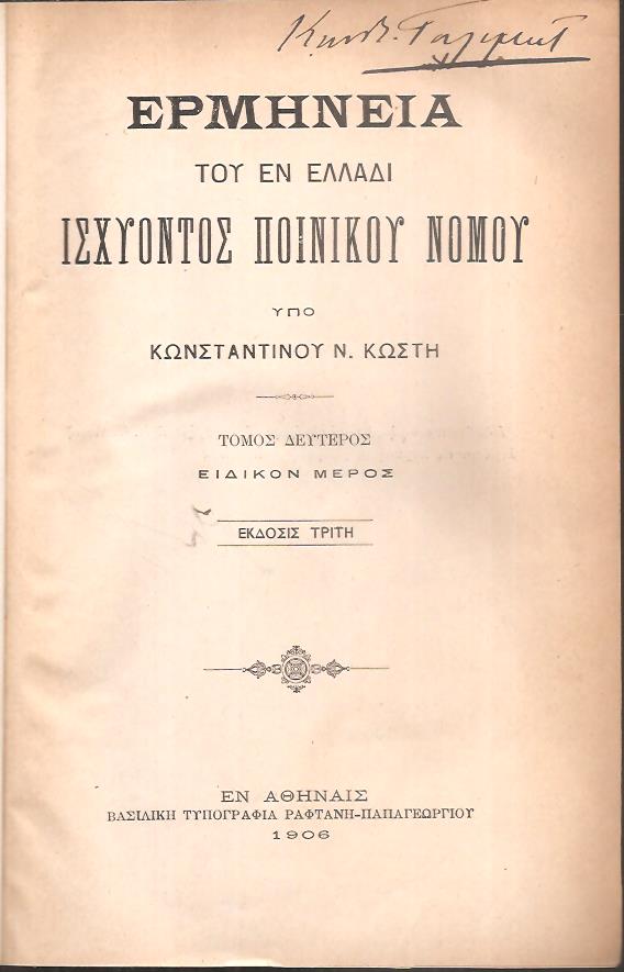 ΚΩΣΤΗΣ ΚΩΝΣΤΑΝΤΙΝΟΣ Ν., Εγχειρίδιον της πολιτικής δικονομίας, έκδοσις τρίτη μετά προσθηκών και βελτιώσεων. Εν Αθήναις 1897, 8ο, σελ. κδ΄+807 [μαζί] Ερμηνεία του εν Ελλάδι ισχύοντος ποινικού νόμου. Τόμος δεύτερος, ειδικόν μέρος, έκδοσις τρίτη. Εν Αθήναις 1906, 8ο, σελ. ιστ΄+621 [μαζί] Ερμηνεία του εν Ελλάδι ισχύοντος ποινικού νόμου. Τόμος τρίτος, Ειδικόν μέρος, έκδοσις τρίτη. Εν Αθήναις 1907, 8ο, σελ. ιη΄+712. (φθαρμένες βιβλιοδεσίες και αποκολλημένες ράχες, ο ένας τόμος χωρίς ράχη και σπασμένα καπάκια, τα κείμενα σε καλή κατάσταση)