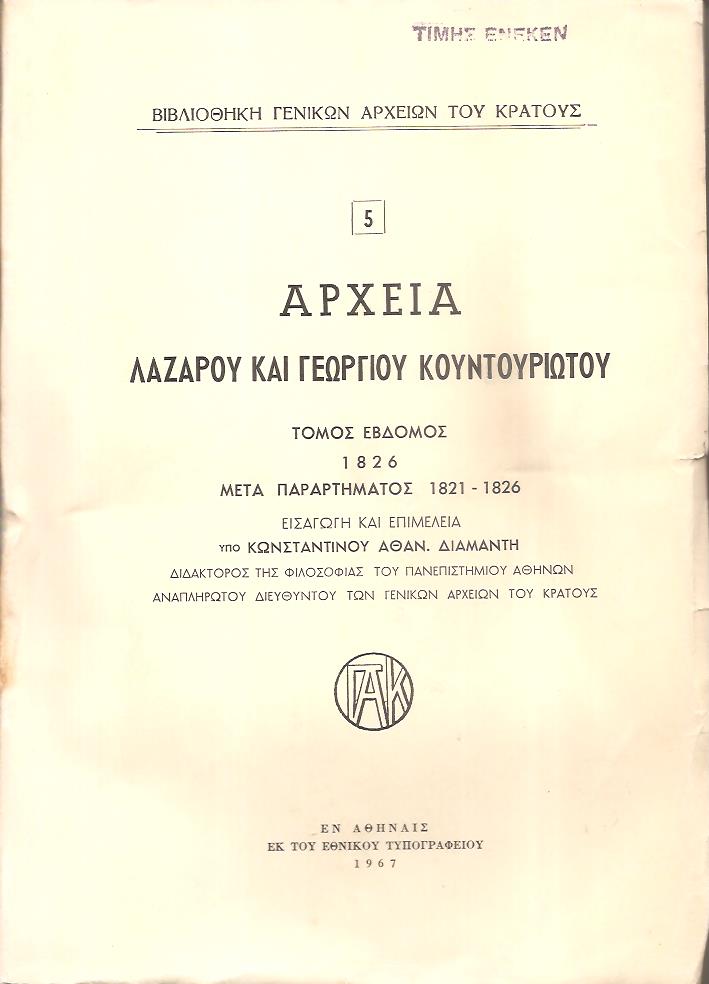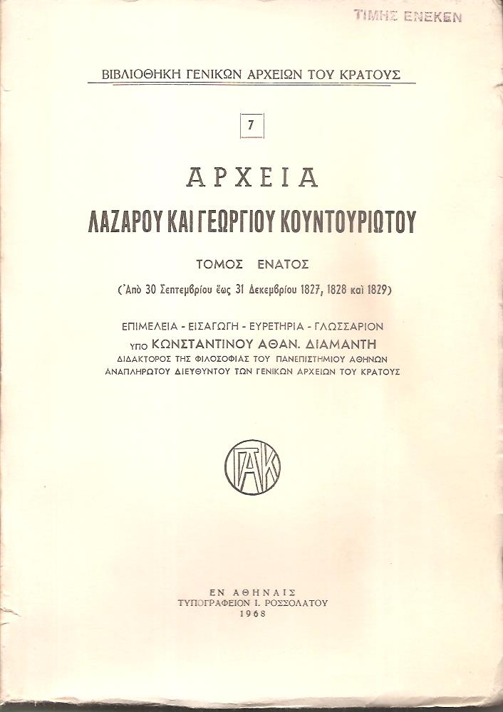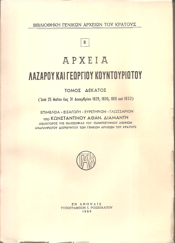 ΒΙΒΛΙΟΘΗΚΗ ΓΕΝΙΚΩΝ ΑΡΧΕΙΩΝ ΤΟΥ ΚΡΑΤΟΥΣ, Αρχεία Λάζαρου και Γεωργίου Κουντουριώτου. Τόμοι 5 (1793-1832). Οι τόμοι 6ος, 7ος, 8ος, 9ος και 10ος. Εισαγωγή, επιμέλεια και σημειώσεις υπό Εμμαν. Γ. Πρωτοψάλτη και Κωνσταντίνου Αθαν. Διαμαντή. Εν Αθήναις 1966 - 1969, 8o, σ. 412+606+480+576+592 (πλήρη σειρά, οι τέσσερις τόμοι με άκοπα φύλλα)