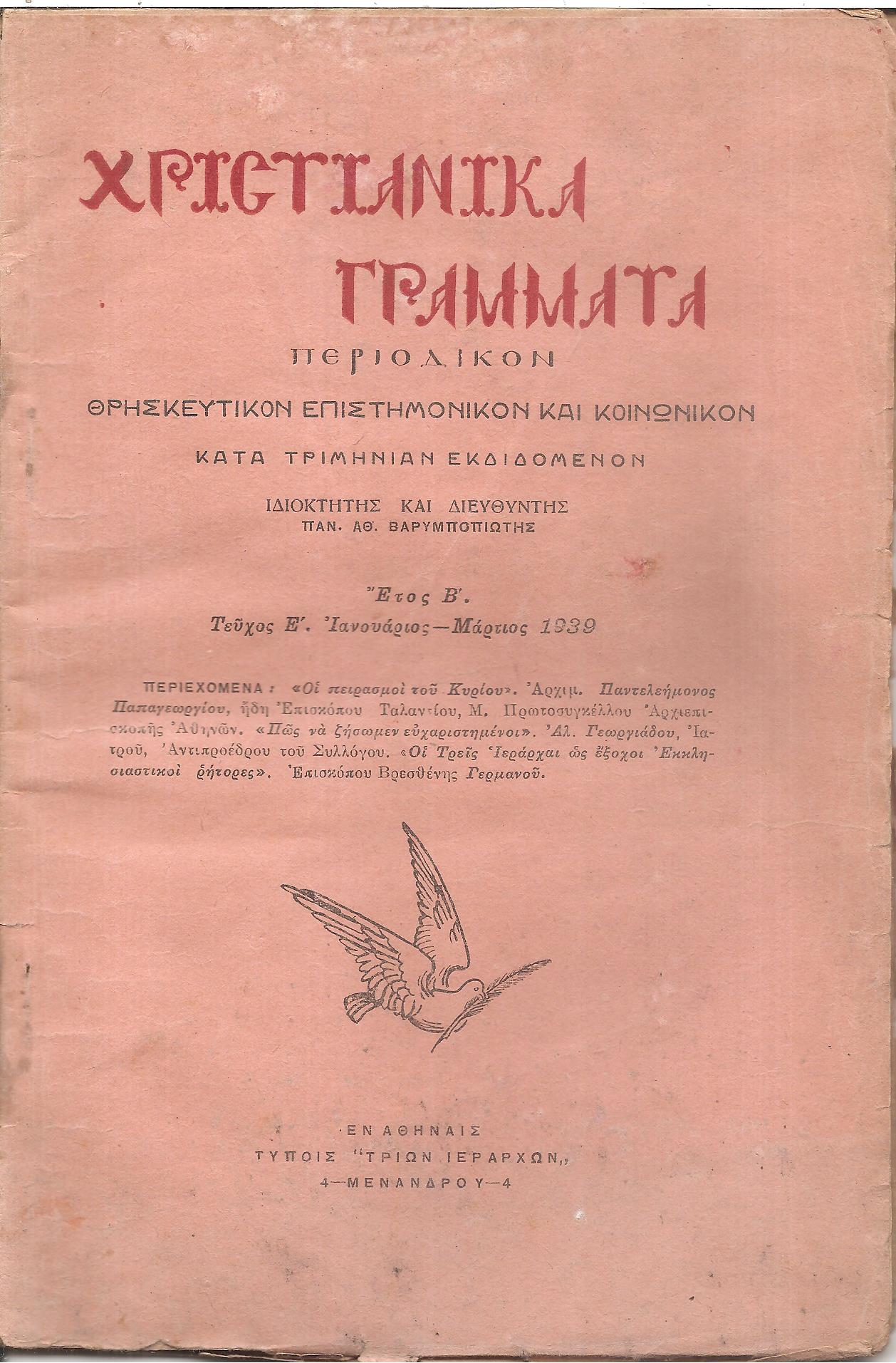 ΧΡΙΣΤΙΑΝΙΚΑ ΓΡΑΜΜΑΤΑ 1938-1941, έτη Α΄-Δ΄, Περιοδικόν θρησκευτικόν, επιστημονικόν και κοινωνικόν κατά τριμηνίαν εκδιδόμενον. Ιδιοκτήτης και Διευθυντής ΠΑΝ. ΑΘ. ΒΑΡΥΜΠΟΠΙΩΤΗΣ. Εν Αθήναις 1938-1941, 8ο, (Διαθέτουμε: ΄Ετος Α΄, τεύχος Α΄[Ιανουάριος-Μάρτιος 1938], σελ. 47+1χ.α., τεύχος Β΄[Απρίλιος-Ιούνιος 1938], σελ. 49-112, τεύχος Γ΄[Ιούλιος- Σεπτέμβριος 1938], σελ. 113-160, λείπει το Δ΄τεύχος [Οκτώβριος- Δεκέμβριος 1938], ΄Ετος Β΄, τεύχος Ε΄[Ιανουάριος-Μάρτιος 1939], σελ. 61+3χ.α., ίχνη υγρασίας, τεύχος ΣΤ΄[Απρίλιος-Ιούνιος 1939], σελ. 65-115+1λ, τεύχος Ζ΄[Ιούλιος- Σεπτέμβριος 1939], σελ. 117-167+1λ, τεύχος Η΄[Οκτώβριος-Δεκέμβριος 1939], σελ. 169-216, ΠΛΗΡΕΣ ΕΤΟΣ, ΄Ετος Γ΄, τεύχος Θ΄[Ιανουάριος-Μάρτιος 1940], σελ. 40, τεύχος Ι΄[Απρίλιος-Ιούνιος 1940], σελ. 41-82, τεύχος ΙΑ΄[Ιούλιος- Σεπτέμβριος 1940], σελ. 83-122, τεύχος ΙΒ΄[Οκτώβριος-Δεκέμβριος 1940], σελ. 123-164, ΠΛΗΡΕΣ ΕΤΟΣ, ΄Ετος Δ΄, τεύχος ΙΓ΄[Ιανουάριος-Μάρτιος 1941], σελ. 52, τεύχος ΙΔ΄[Απρίλιος-Ιούνιος 1941], σελ. 53-96, τεύχος ΙΕ΄-ΙΣΤ΄[Ιούλιος- Δεκέμβριος 1941], σελ. 97-122, ΠΛΗΡΕΣ ΕΤΟΣ). Σύνολον 14 τεύχη με τα εξώφυλλα