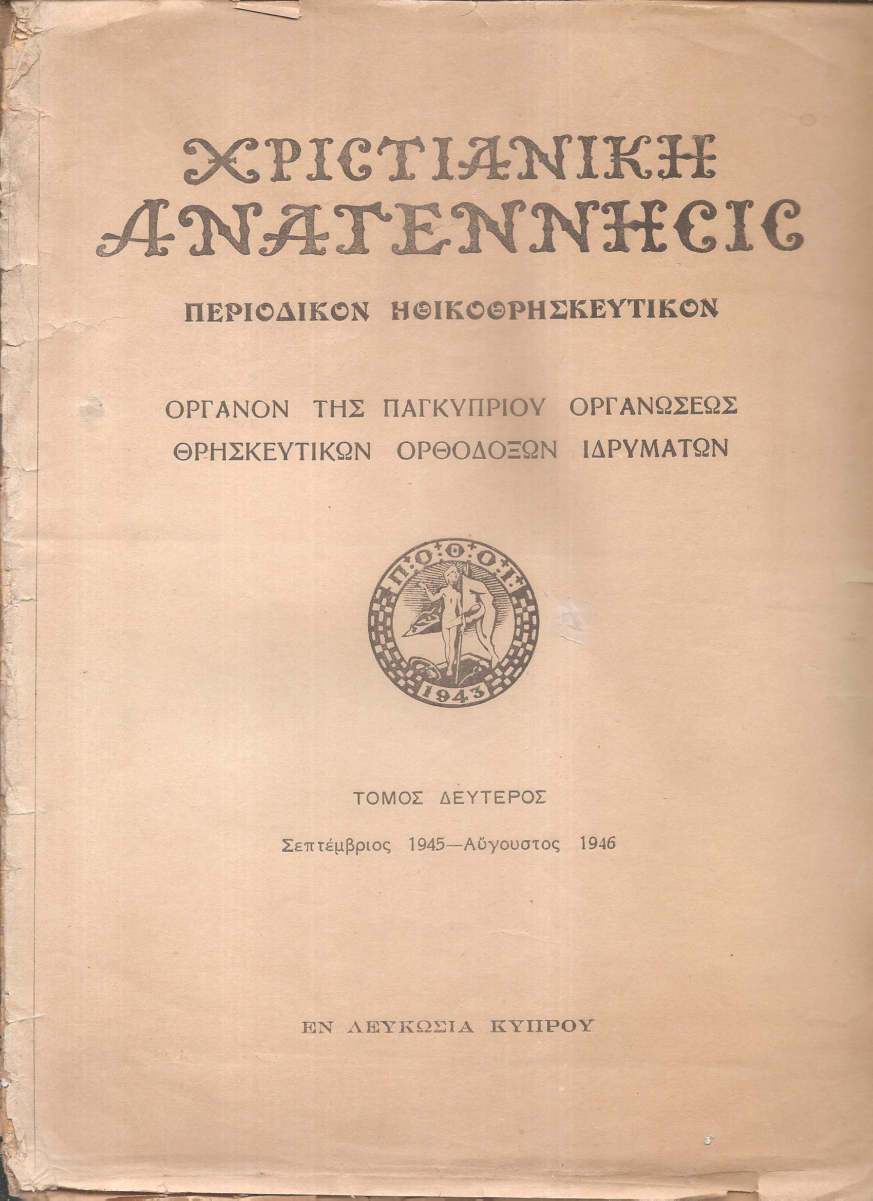 «ΧΡΙΣΤΙΑΝΙΚΗ ΑΝΑΓΕΝΝΗΣΙΣ» τόμοι 1ος+2ος, 1944-1946(μόνο), Περιοδικόν ηθικοθρησκευτικόν.΄Οργανον της Παγκυπρίου Οργανώσεως Θρησκευτικών Ορθοδόξων Ιδρυμάτων