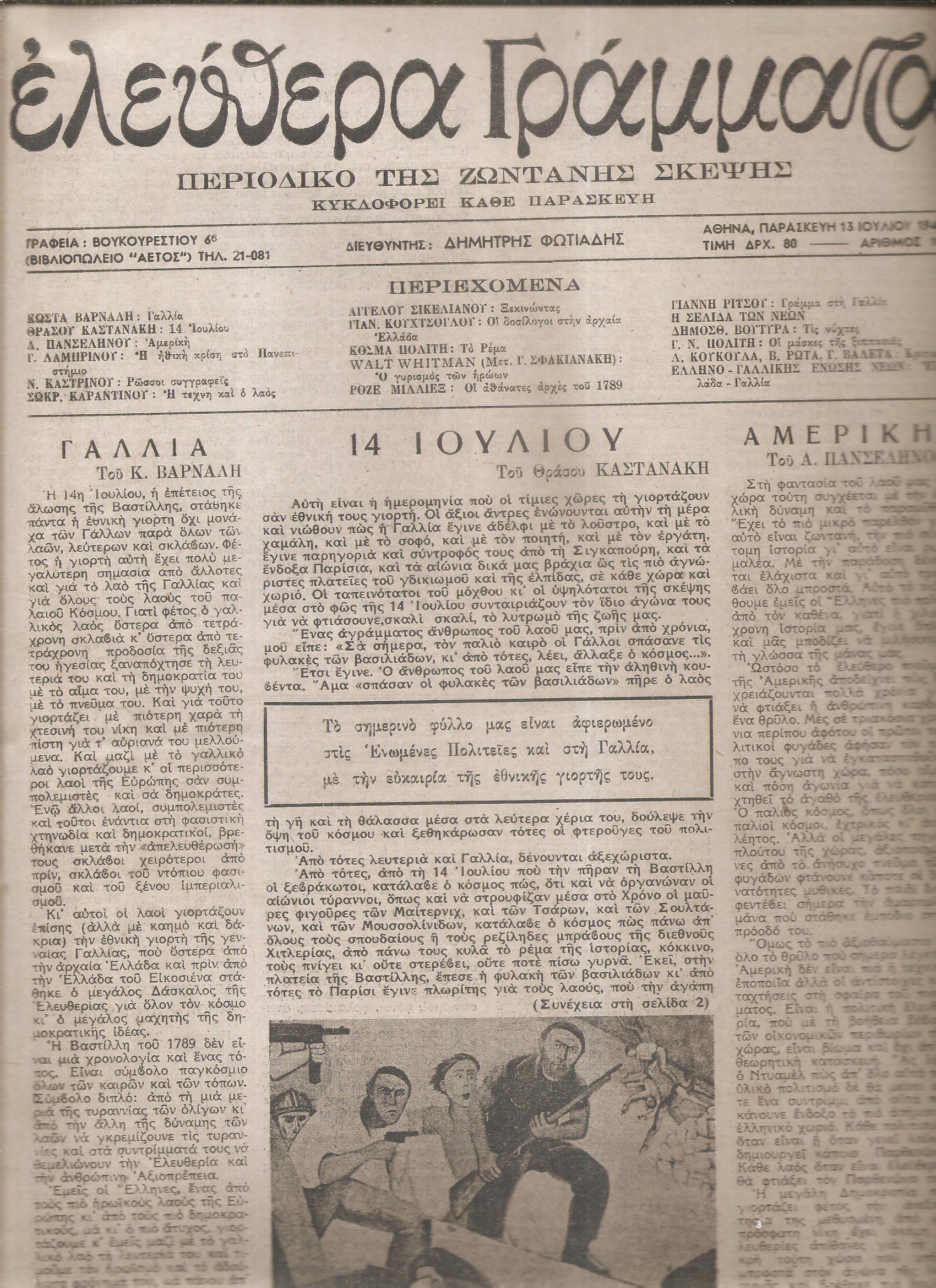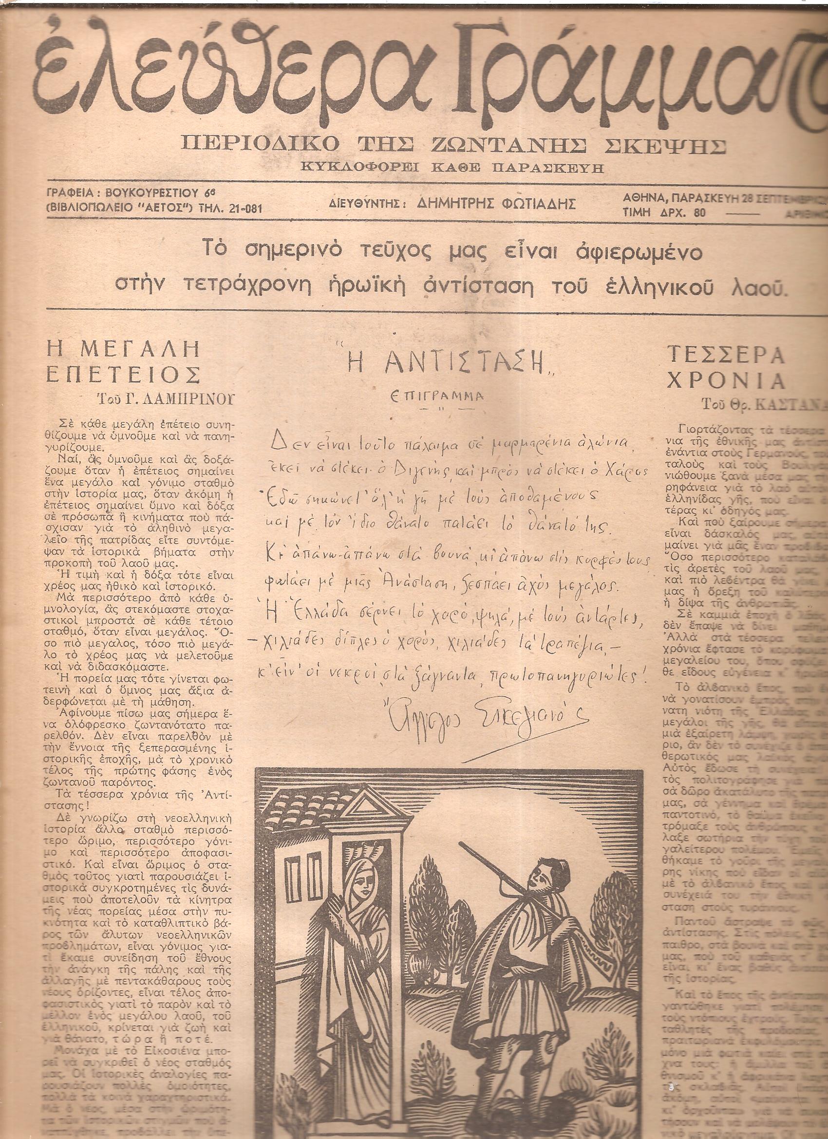 ΕΛΕΥΘΕΡΑ ΓΡΑΜΜΑΤΑ Περίοδος Α΄, τόμος Α΄, 1945, Περιοδικό της ζωντανής σκέψης-κυκλοφορεί κάθε Σάββατο. Διευθυντής: Δημήτρης Φωτιάδης. Αθήνα 1945, 4ο [25Χ35], σελ. 16[το τεύχος]. (Τόμος Α΄, τεύχη αρ. 1[5 Μαΐου 1945]έως αρ. 32-33[21 Δεκεμβρίου 1945], κάθε τεύχος 16σέλιδο), μετά το 10ο τεύχος κυκλοφορούσε κάθε Παρασκευή. Δημοσιεύματα των: ΦΩΤΗ ΑΓΓΟΥΛΕ, ΕΛΛΗΣ ΑΛΕΞΙΟΥ, Φ. ΑΝΩΓΕΙΑΝΝΑΚΗ, ΜΕΛΠΩΣ ΑΞΙΩΤΗ, ΦΩΤΗ ΑΣΤΕΡΗ, ΜΑΡΚΟΥ ΑΥΓΕΡΗ, Κ. ΒΑΡΝΑΛΗ, ΣΠ. ΒΑΣΙΛΕΙΟΥ, ΗΛ. ΒΕΝΕΖΗ, ΔΗΜΟΣΘ. ΒΟΥΤΥΡΑ, ΝΙΚ. ΒΡΕΤΤΑΚΟΥ, ΤΑΤΙΑΝΑΣ ΓΚΡΙΤΖΗ-ΜΙΛΛΙΕΞ, ΦΩΤΟΥ ΓΙΟΦΥΛΛΗ, ΛΕΥΤ. ΓΡΗΓΟΡΙΟΥ, Ν. ΖΑΧΑΡΙΑΔΗ, ΑΓΙ ΘΕΡΟΥ, Γ. ΘΕΜΕΛΗ, ΡΟΖΑ ΙΜΒΡΙΩΤΗ, Χ. ΘΕΟΔΩΡΙΔΗ, Ν. ΚΑΒΒΑΔΙΑ, Ν. ΚΑΖΑΝΤΖΑΚΗ-Ι.Θ. ΚΑΚΡΙΔΗ, ΘΡ. ΚΑΣΤΑΝΑΚΗ, ΝΙΚΟΥ ΚΑΣΤΡΙΝΟΥ, ΦΩΤΗ ΚΟΝΤΟΓΛΟΥ, Γ. ΚΟΡΔΑΤΟΥ, Θ. ΚΟΡΝΑΡΟΥ, Γ. ΚΟΤΖΙΟΥΛΑ, Λ. ΚΟΥΚΟΥΛΑ, Γ. ΛΑΜΠΡΙΝΟΥ, ΧΡ. ΛΕΒΑΝΤΑ, Π. ΛΕΚΑΤΣΑ, ΜΕΝ. ΛΟΥΝΤΕΜΗ, Γ. ΜΑΚΡΗ, ΤΙΜΟΥ ΜΑΛΑΝΟΥ, ΣΟΦ. ΜΑΥΡΟΕΙΔΗ-ΠΑΠΑΔΑΚΗ, Ρ. ΜΙΛΛΙΕΞ, ΡΙΤΑΣ ΜΠΟΥΜΗ-ΠΑΠΑ, ΜΥΡΤΙΩΤΙΣΣΑΣ, ΛΕΩΝ. ΜΩΡΑΪΤΗ, ΚΟΛΙΑ ΝΗΣΙΩΤΗ, ΣΤ. ΞΕΦΛΟΥΔΑ, Ι. Μ. ΠΑΝΑΓΙΩΤΟΠΟΥΛΟΥ, ΔΗΜ. ΠΑΝΔΗ, Α. ΠΑΝΣΕΛΗΝΟΥ, ΝΙΚΟΥ Δ. ΠΑΠΑ, ΕΛΛΗΣ ΠΑΠΑΔΗΜΗΤΡΙΟΥ, ΛΙΛΗΣ ΠΑΤΡΙΚΙΟΥ-ΙΑΚΩΒΙΔΗ, ΜΙΧ. ΠΕΡΑΝΘΗ, Θ. ΠΙΕΡΙΔΗ, ΚΟΣΜΑ ΠΟΛΙΤΗ, Π. ΠΡΕΒΕΛΑΚΗ, Θ. Γ. ΡΙΤΣΟΥ, Β. ΡΩΤΑ, Ν. ΣΒΟΡΩΝΟΥ, Α. ΣΙΚΕΛΙΑΝΟΥ, ΑΠ. ΣΠΗΛΙΟΥ, Τ. Α. ΣΤΑΜΑΤΟΠΟΥΛΟΥ ΘΡΑΣ. ΣΤΑΥΡΟΥ, Κ. Δ. ΣΩΤΗΡΙΟΥ, Α. ΤΑΣΣΟΥ, ΑΓΓ. ΤΕΡΖΑΚΗ, ΜΑΡΚΟΥ ΤΣΙΡΙΜΩΚΟΥ, ΣΤΡΑΤΗ ΤΣΙΡΚΑ, Δ. ΦΩΤΙΑΔΗ, Γ. ΧΑΤΖΙΝΗ, κ.α. Ξυλογραφίες των: ΑΓΓ. ΘΕΟΔΩΡΟΠΟΥΛΟΥ, ΒΑΣΩ, Β. ΣΕΜΕΡΤΖΙΔΗ, Α. ΚΟΡΟΓΙΑΝΝΑΚΗ, Γ. ΒΑΚΑΛΟ, Γ. ΜΑΝΟΥΣΑΚΗ, ΕΥΘΥΜΗ ΠΑΠΑΔΗΜΗΤΡΙΟΥ, Α. ΑΣΤΕΡΙΑΔΗ, ΣΠ. ΒΑΣΙΛΕΙΟΥ, ΟΡΕΣΤΗ ΚΑΝΕΛΛΗ, Α. ΤΑΣΣΟΥ Σύνολον 28 τεύχη[μονά-διπλά],ΠΛΗΡΗΣ ΤΟΜΟΣ
