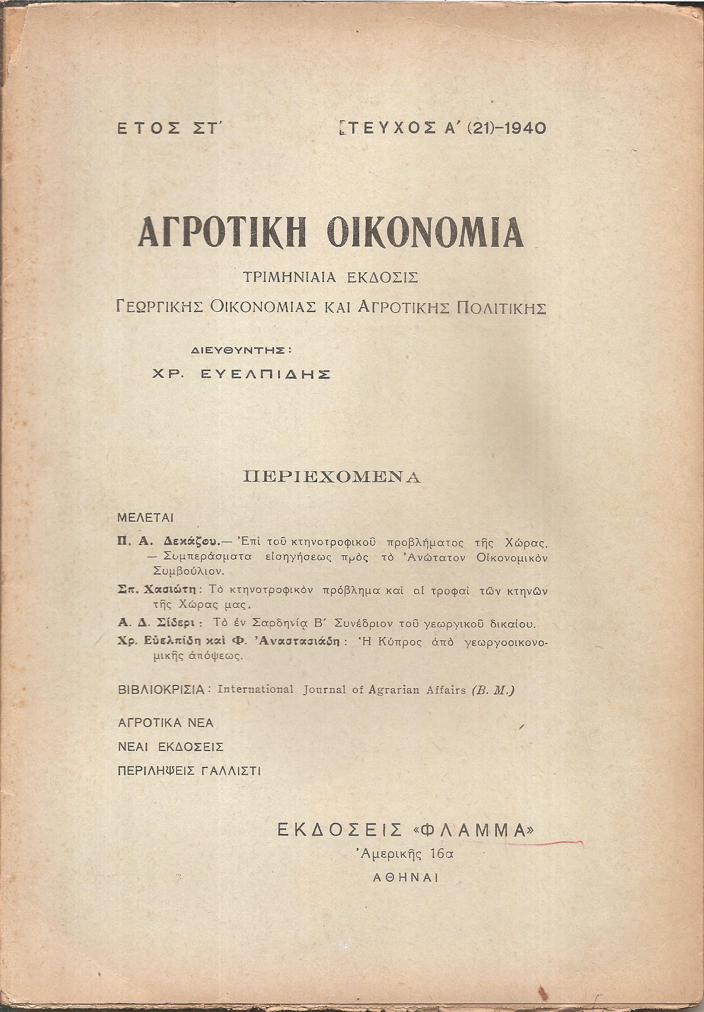 «ΑΓΡΟΤΙΚΗ ΟΙΚΟΝΟΜΙΑ» 1935-1967, Τριμηνιαία έκδοσις γεωργικής οικονομίας και αγροτικής πολιτικής. Διευθυντής : ΧΡ. ΕΥΕΛΠΙΔΗΣ , Αρχισυντάκτης : ΑΡ. ΚΡΙΑΡΗΣ . Αθήναι 1935 –1967, 8ο  ( Διαθέτουμε μεμονωμένα τα τεύχη : ΄Ετος Α΄ (1935), το τεύχος Α΄, σελ. 132, το τεύχος Γ΄, σελ.261-364. ΄Ετος Γ΄(1937), τα τεύχη Β΄, σελ.113-208, το Γ΄, σελ. 209-314+2χ.α. & το Δ΄,σελ.317-447+3χ.α. ΄Ετος Δ΄(1938), το τεύχος Β΄(αρ. 14), σελ. 113-224. ΄Ετος ΣΤ΄(1940), το τεύχος Α΄ (αρ. 21), σελ.81+3χ.α. ΄Ετος Κ΄(1961), τεύχος αρ. 28 [ Οκτώβρ. – Δεκέμβριος 1961], σελ. 265-359+1χ.α. ΄Ετος ΚΑ΄(1962), τεύχος αρ. 31 [Ιούλιος – Σεπτέμβριος 1962], σελ. 181-274+2χ.α. ΄Ετος ΚΒ΄(1963), τεύχος αρ. 33 [Ιανουάριος – Μάρτιος 1963], σελ. 92+4χ.α., τεύχος αρ. 34 [Απρίλιος – Ιούνιος 1963], σελ. 97-182+2χ.α. ΄Ετος ΚΓ΄(1964), τεύχος αρ. 37 [Ιανουάριος- Μάρτιος 1964], σελ. 91+5χ.α., τεύχος αρ. 40 [Οκτώβριος-Δεκέμβριος 1964], σελ. 265-347+1χ.α. ΄Ετος ΚΔ΄(1965), τεύχος αρ. 43 [Ιούλιος – Σεπτέμβριος 1965], σελ. 161- 239 +1χ.α., τεύχος αρ. 44 [Οκτώβριος – Δεκέμβριος 1965], σελ. 241- 319+ 1χ.α. ΄Ετος ΚΕ΄(1966), τεύχος αρ. 46 [ Απρίλιος – Ιούνιος 1966], σελ. 81- 158+2χ.α., τεύχος αρ. 47 [Ιούλιος- Σεπτέμβριος 1966], σελ. 161-239+1χ.α., τεύχος αρ. 48 [Οκτώβριος-Δεκέμβριος 1966], σελ. 241-326+2χ.α. ΄Ετος ΚΣΤ΄(1967), τεύχος αρ. 49 [Ιανουάριος- Μάρτιος 1967], σελ. 78+2χ.α., τεύχος αρ. 50 [Απρίλιος – Ιούνιος 1967], σελ. 81- 141+3χ.α., τεύχος αρ. 51 [Ιούλιος – Σεπτέμβριος 1967], σελ. 145- 221+3χ.α. ). Συνεργάστηκαν : ΣΠ. ΧΑΣΙΩΤΗΣ,  Α. Δ. ΣΙΔΕΡΙΣ,  Π. Α. ΔΕΚΑΖΟΣ, Σ. ΠΑΠΑΝΔΡΕΟΥ, Ε.Ι. ΤΣΟΥΔΕΡΟΣ, Ν. ΑΝΑΓΝΩΣΤΟΠΟΥΛΟΣ, Δ. ΑΘ. ΠΑΝΟΥ,  ΑΡ. ΚΡΙΑΡΗΣ, Π.Γ.ΚΟΥΤΣΟΜΗΤΟΠΟΥΛΟΣ, ΧΡ. Α. ΒΑΣΜΑΤΖΙΔΗΣ, Ν. Θ. ΘΕΟΔΩΡΟΥ, ΣΤ. Ν. ΜΑΚΡΑΚΗΣ,  κ.α. ΕΚΑΣΤΟ ΤΕΥΧΟΣ  € 3,18/1,59