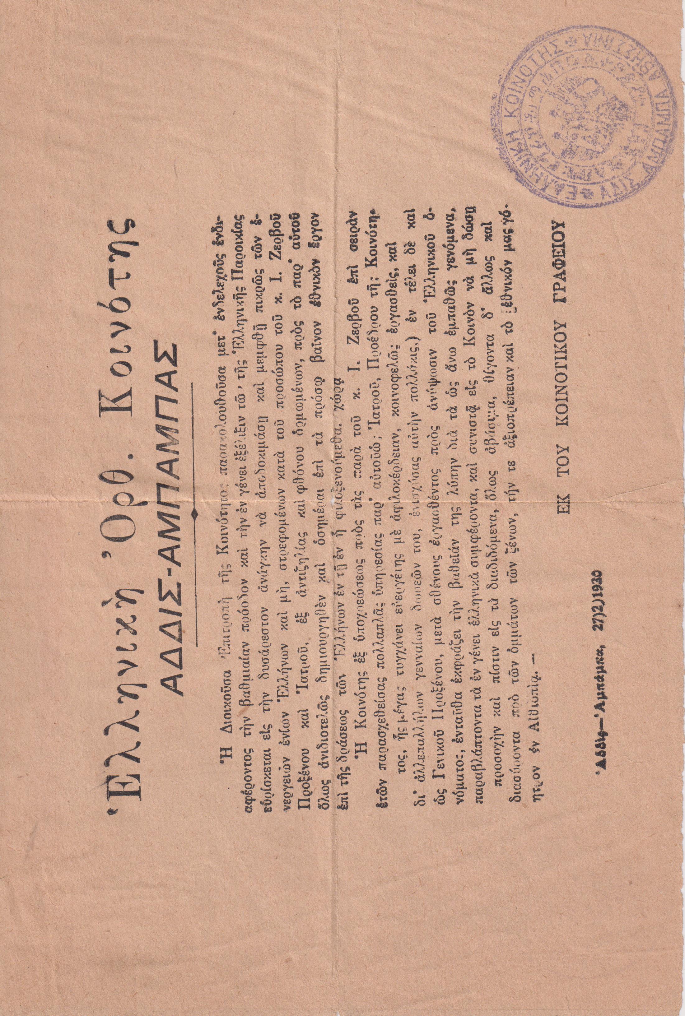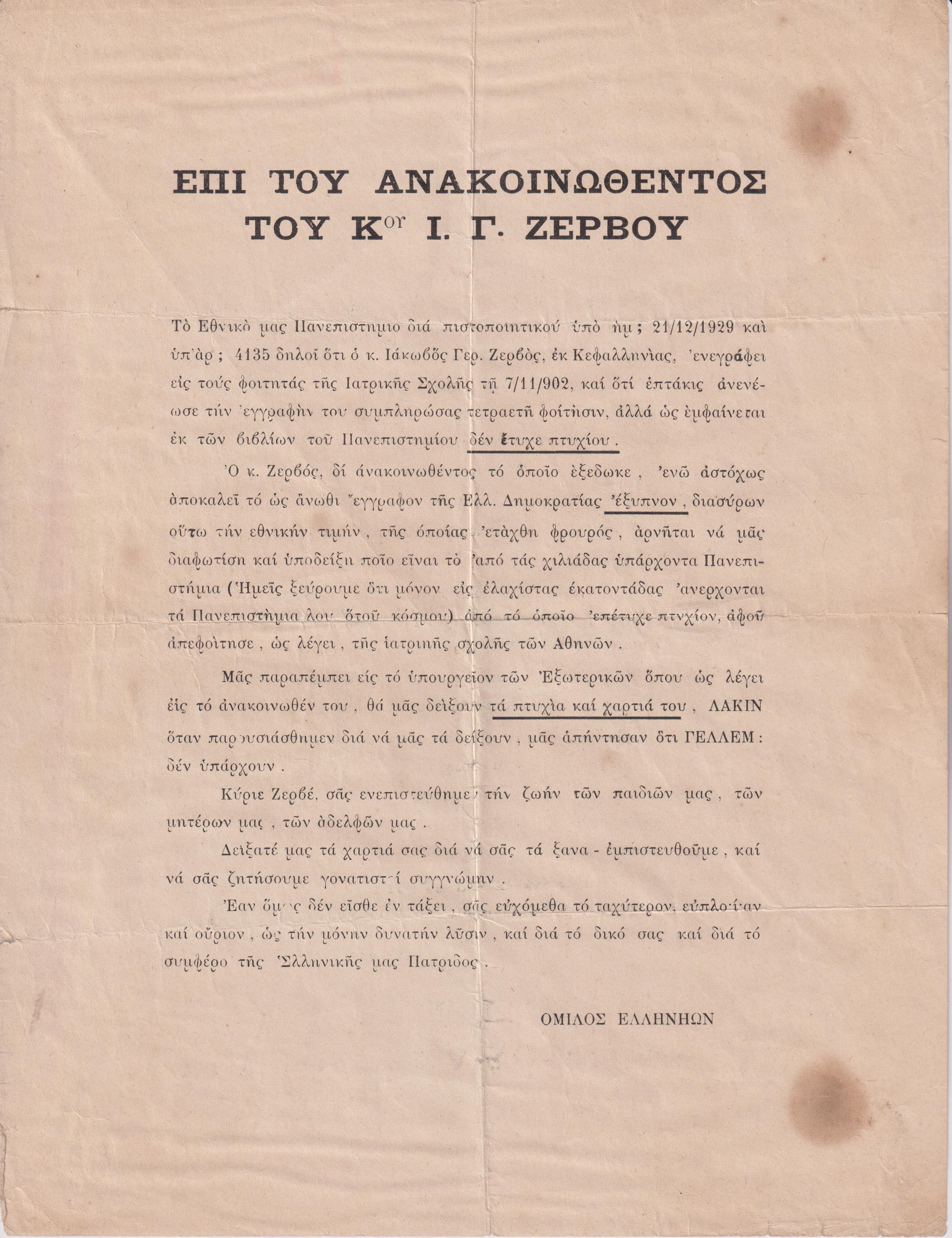 Ελληνική Ορθοδόξος Κοινότητα Αντίς Αμπέμπα Αιθιοπίας - Ιάκωβος Γερ. Ζερβός. Έντυπες ανακοινώσεις της Ελληνικής Ορθοδόξου Κοινότητος Αδδίς Αμπάμπα, του Ιατρού των ανακτόρων και Προξένου Ιάκωβου Γερ. Ζερβού εκ Κεφαλληνίας και του Ομίλου Ελλήνων της περιοχής, αναφορικά με την κατηγορία ότι δεν πήρε πτυχίο Ιατρικής από το Πανεπιστήμιο Αθηνών. Μονόφυλλα, 1930 περ. (28x22, 19x28, 29x28 εκ.). Τεκμήρια 3.