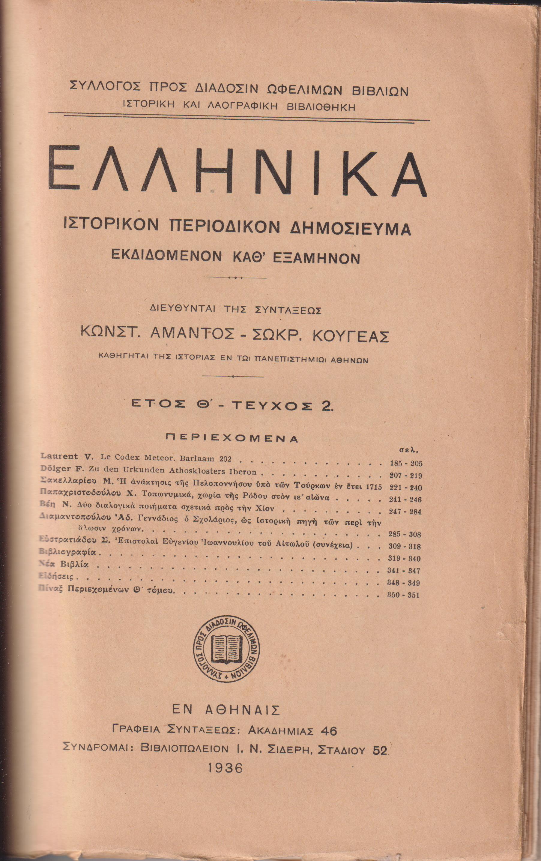 ΕΛΛΗΝΙΚΑ έτος Θ΄ 1936, τεύχη 1-2, Ιστορικόν Περιοδικόν Δημοσίευμα. Εκδιδόμενον καθ’εξάμηνον. Διευθυνταί της συντάξεως : ΚΩΝΣ. ΑΜΑΝΤΟΣ –ΣΩΚΡ. ΚΟΥΓΕΑΣ . Εν Αθήναις 1936, 8ο, σελ. 184+4πιν.αναδιπλ.+[185]-351+1λ. (τα δύο τεύχη με τα εξώφυλλά τους μαζί ενωμένα με θερμοκόλληση, πολλά φύλλα άκοπα). ΠΛΗΡΗΣ ΤΟΜΟΣ