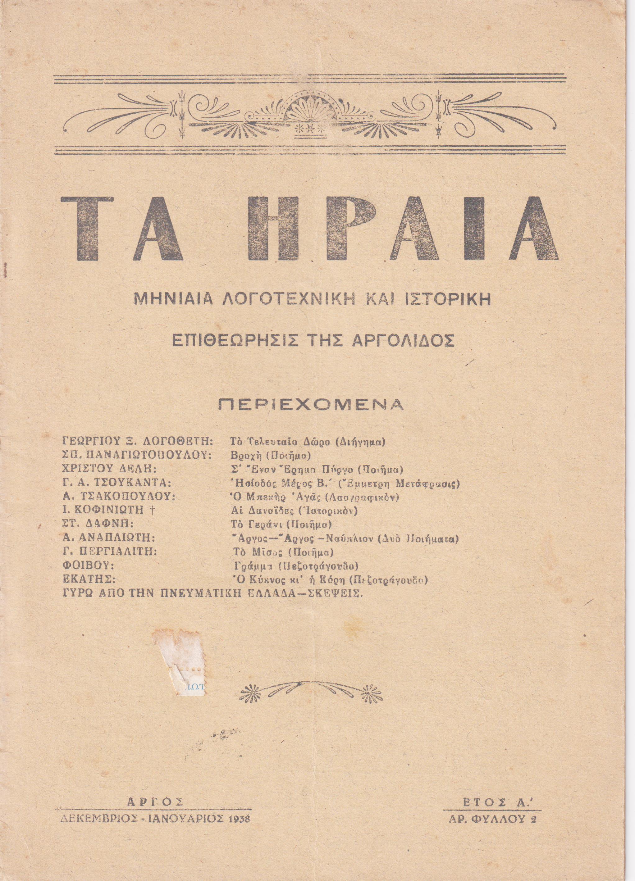 ΗΡΑΙΑ [ΤΑ] 1937-1940, Μηνιαία Λογοτεχνική και Ιστορική Επιθεώρησις της Αργολίδος. Ιδρυταί: Γ. Λογοθέτης- Γ. Τσουκαντάς. ΄Αργος 1937-1940,   8ο, σελ. 16[έκαστο τεύχος], (Διαθέτουμε τα τεύχη: ΄Ετος Α΄,  αρ. 1[Νοέμβριος 1937] έως ΄Ετος Γ΄, αρ. 32-33[Οκτώβριος-Νοέμβριος 1940]. Λείπει το 16ο τεύχος [Απρίλιος 1939]Δημοσιεύματα των : ΓΕΩΡΓΙΟΥ Ξ. ΛΟΓΟΘΕΤΗ, Γ. ΤΣΟΥΚΑΝΤΑ, ΓΙΑΝΝΗ ΠΕΡΓΙΑΛΙΤΗ, ΦΟΙΒΟΥ, ΣΤΕΦ. ΔΑΦΝΗ, Γ. ΝΕΖΟΥ, Σ. ΔΗΜΟΠΟΥΛΟΥ,  Α. ΑΝΑΠΛΙΩΤΗ, ΕΚΑΤΗΣ, ΧΡΙΣΤΟΥ ΔΕΛΗ, Α. ΤΣΑΚΟΠΟΥΛΟΥ, Κ. Ν. ΟΛΥΜΠΙΟΥ, Ε. ΜΠΟΜΠΟΥ, ΜΕΜΑΣ ΠΡΙΦΤΗΣ, ΤΩΝΗ ΑΡΓΕΙΤΗ, Γ. Θ. ΜΑΛΤΕΖΟΥ, ΤΑΚΗ ΔΟΞΑ, Γ. ΦΙΛΙΠΠΟΠΟΥΛΟΥ, ΑΛΕΚΟΥ ΜΟΥΤΖΟΥΡΙΔΗ, ΑΙΜΙΛΙΑΣ ΣΤΕΦ. ΔΑΦΝΗ, ΥΠΑΤΙΑΣ ΔΕΛΗ, ΓΙΑΝΝΗΣ ΒΟΥΛΓΑΡΙΔΗΣ, ΤΑΚΗΣ ΤΑΧΤΙΚΟΣ, Ι. Κ. ΚΟΦΙΝΙΩΤΗ, ΓΙΑΝΝΗ ΦΛΙΑΣΙΟΥ, ΕΡΑΣΜΟΥ, ΝΙΚ. Σ. ΓΚΙΝΟΠΟΥΛΟΥ, ΠΑΝ. ΔΗΜ. ΣΕΦΕΡΛΗ, Δ. ΔΑΝΟΠΟΥΛΟΥ, ΠΑΥΛΟΥ ΡΟΥΜΠΕΚΑ, ΝΙΚΟΥ ΤΡΙΒΙΖΑ, ΒΑΣ. Κ. ΛΟΝΤΟΥ, ΔΗΜ. ΒΑΡΔΟΥΝΙΩΤΗ, ΠΑΝΟΥ Ν. ΚΑΡΑΒΙΑ, ΓΙΑΝΝΗ ΦΩΤΑΚΗ, ΑΓ. ΤΣΕΛΑΛΗ, ΑΓΓΕΛΟΥ ΧΑΔΙΑΡΑΚΟΥ κ.α.  Σύνολον 21 τεύχη μονά ή διπλά.