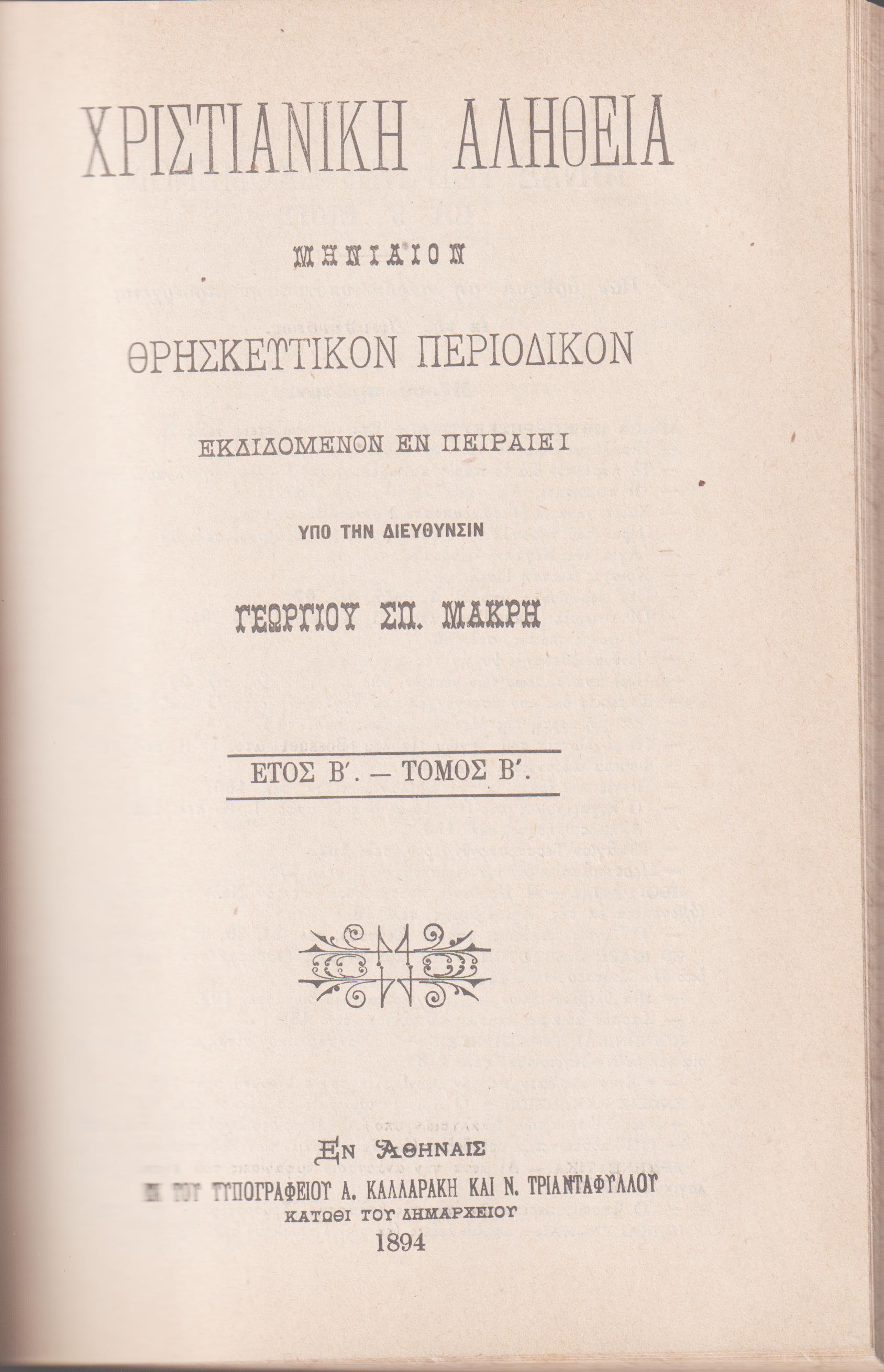 ΧΡΙΣΤΙΑΝΙΚΗ ΑΛΗΘΕΙΑ 1893-1897, τόμοι Α΄-Ε΄, Μηνιαίον Θρησκευτικόν περιοδικόν εκδιδόμενον εν Πειραιεί υπό την Διεύθυνσιν Γεωργίου Σπ. Μακρή. Εν Αθήναις, ΕΚ ΤΟΥ ΤΥΠΟΓΡΑΦΕΙΟΥ Α. ΚΟΛΛΑΡΑΚΗ και Ν. ΤΡΙΑΝΤΑΦΥΛΛΟΥ, 1893-1897, 8ο, σελ. τ. Α΄, δ΄+192+τ. Β΄, δ΄+192+τ. Γ΄, δ΄+192+τ. Δ΄, δ΄+192+τ. Ε΄, δ΄+160 (τα πέντε[5] έτη δεμένα σ’ ένα τόμο δερματόδετο[μαύρο] εποχής, η βιβλιοδεσία ελαφρώς ταλαιπωρημένη, το αντίτυπο σε καλή κατάσταση. Στο τόμο Α΄ οι σελίδες γ΄-δ΄ είναι ραμμένες από τον βιβλιοδέτη σε λάθος θέση)