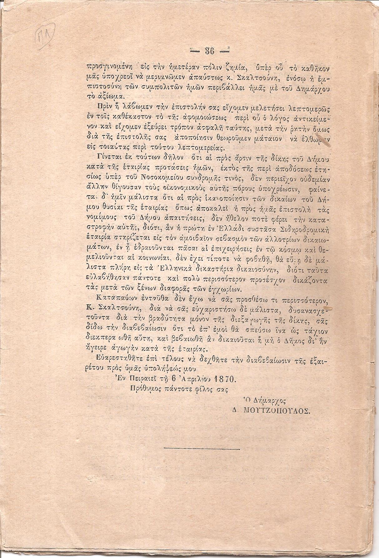 Η επίσημος του Δήμου Πειραιώς αλληλογραφία περί της κινηθείσης υπ’αυτού κατά της Εταιρίας του Σιδηροδρόμου δίκης και η εις την Βουλήν προς κύρωσιν υποβληθείσα Σύμβασις… Εν Πειραιεί 1871, 8ο, σελ. 1χ.α.+1λ+36 (ο τίτλος στο εξώφυλλο, λείπει το οπισθόφυλλο, σπάνιο, ΗΛΙΟΥ-ΠΟΛΕΜΗ αρ. 1871.250)