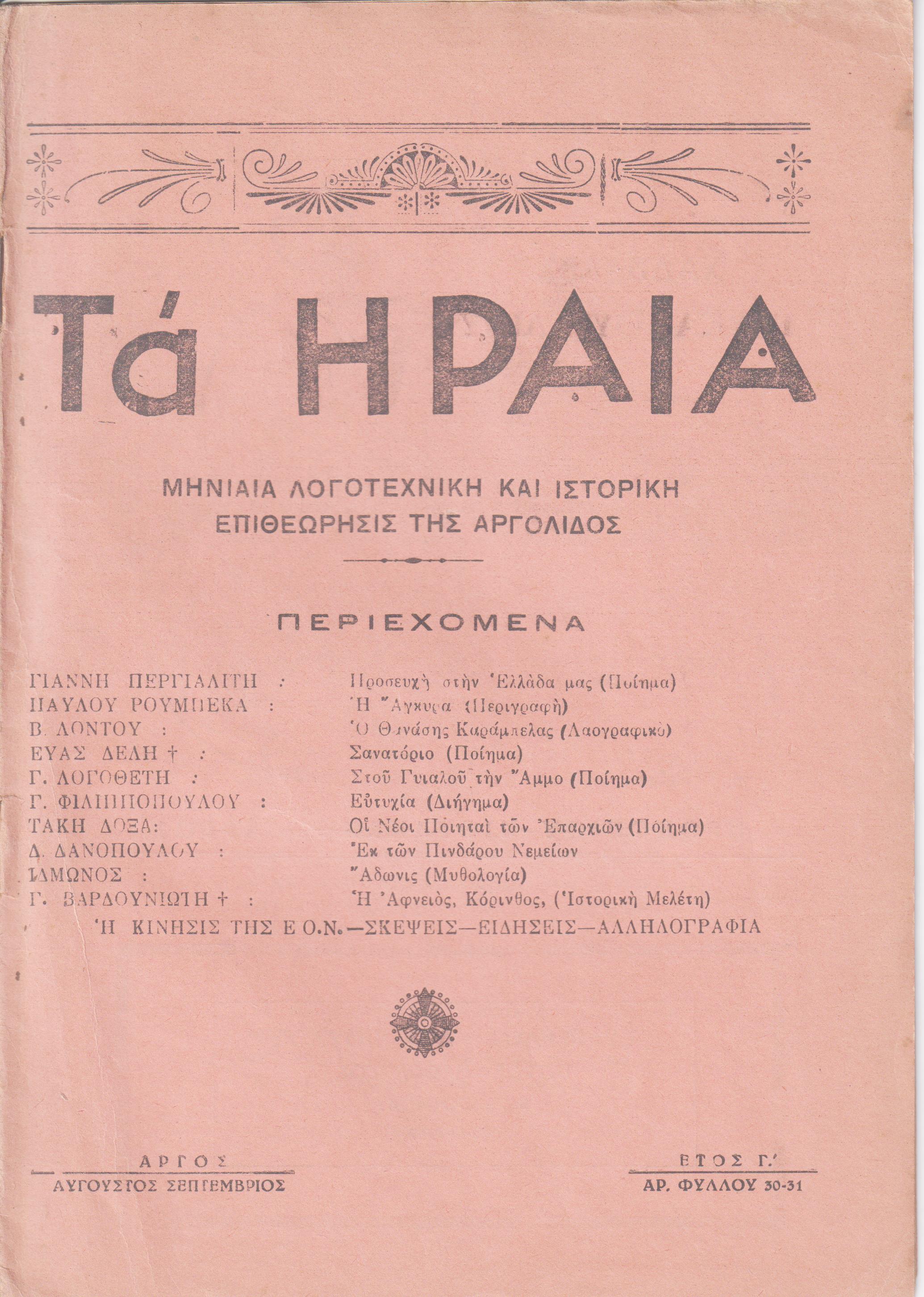 ΗΡΑΙΑ [ΤΑ] 1937-1940, Μηνιαία Λογοτεχνική και Ιστορική Επιθεώρησις της Αργολίδος. Ιδρυταί: Γ. Λογοθέτης- Γ. Τσουκαντάς. ΄Αργος 1937-1940, 8ο, σελ. 16[έκαστο τεύχος], (Διαθέτουμε τα τεύχη: ΄Ετος Α΄, αρ. 1[Νοέμβριος 1937] έως ΄Ετος Γ΄, αρ. 32-33[Οκτώβριος-Νοέμβριος 1940]. Λείπει το 16ο τεύχος [Απρίλιος 1939]. Δημοσιεύματα των : ΓΕΩΡΓΙΟΥ Ξ. ΛΟΓΟΘΕΤΗ, Γ. ΤΣΟΥΚΑΝΤΑ, ΓΙΑΝΝΗ ΠΕΡΓΙΑΛΙΤΗ, ΦΟΙΒΟΥ, ΣΤΕΦ. ΔΑΦΝΗ, Γ. ΝΕΖΟΥ, Σ. ΔΗΜΟΠΟΥΛΟΥ, Α. ΑΝΑΠΛΙΩΤΗ, ΕΚΑΤΗΣ, ΧΡΙΣΤΟΥ ΔΕΛΗ, Α. ΤΣΑΚΟΠΟΥΛΟΥ, Κ. Ν. ΟΛΥΜΠΙΟΥ, Ε. ΜΠΟΜΠΟΥ, ΜΕΜΑΣ ΠΡΙΦΤΗΣ, ΤΩΝΗ ΑΡΓΕΙΤΗ, Γ. Θ. ΜΑΛΤΕΖΟΥ, ΤΑΚΗ ΔΟΞΑ, Γ. ΦΙΛΙΠΠΟΠΟΥΛΟΥ, ΑΛΕΚΟΥ ΜΟΥΤΖΟΥΡΙΔΗ, ΑΙΜΙΛΙΑΣ ΣΤΕΦ. ΔΑΦΝΗ, ΥΠΑΤΙΑΣ ΔΕΛΗ, ΓΙΑΝΝΗΣ ΒΟΥΛΓΑΡΙΔΗΣ, ΤΑΚΗΣ ΤΑΧΤΙΚΟΣ, Ι. Κ. ΚΟΦΙΝΙΩΤΗ, ΓΙΑΝΝΗ ΦΛΙΑΣΙΟΥ, ΕΡΑΣΜΟΥ, ΝΙΚ. Σ. ΓΚΙΝΟΠΟΥΛΟΥ, ΠΑΝ. ΔΗΜ. ΣΕΦΕΡΛΗ, Δ. ΔΑΝΟΠΟΥΛΟΥ, ΠΑΥΛΟΥ ΡΟΥΜΠΕΚΑ, ΝΙΚΟΥ ΤΡΙΒΙΖΑ, ΒΑΣ. Κ. ΛΟΝΤΟΥ, ΔΗΜ. ΒΑΡΔΟΥΝΙΩΤΗ, ΠΑΝΟΥ Ν. ΚΑΡΑΒΙΑ, ΓΙΑΝΝΗ ΦΩΤΑΚΗ, ΑΓ. ΤΣΕΛΑΛΗ, ΑΓΓΕΛΟΥ ΧΑΔΙΑΡΑΚΟΥ κ.α. Σύνολον 21 τεύχη μονά ή διπλά.