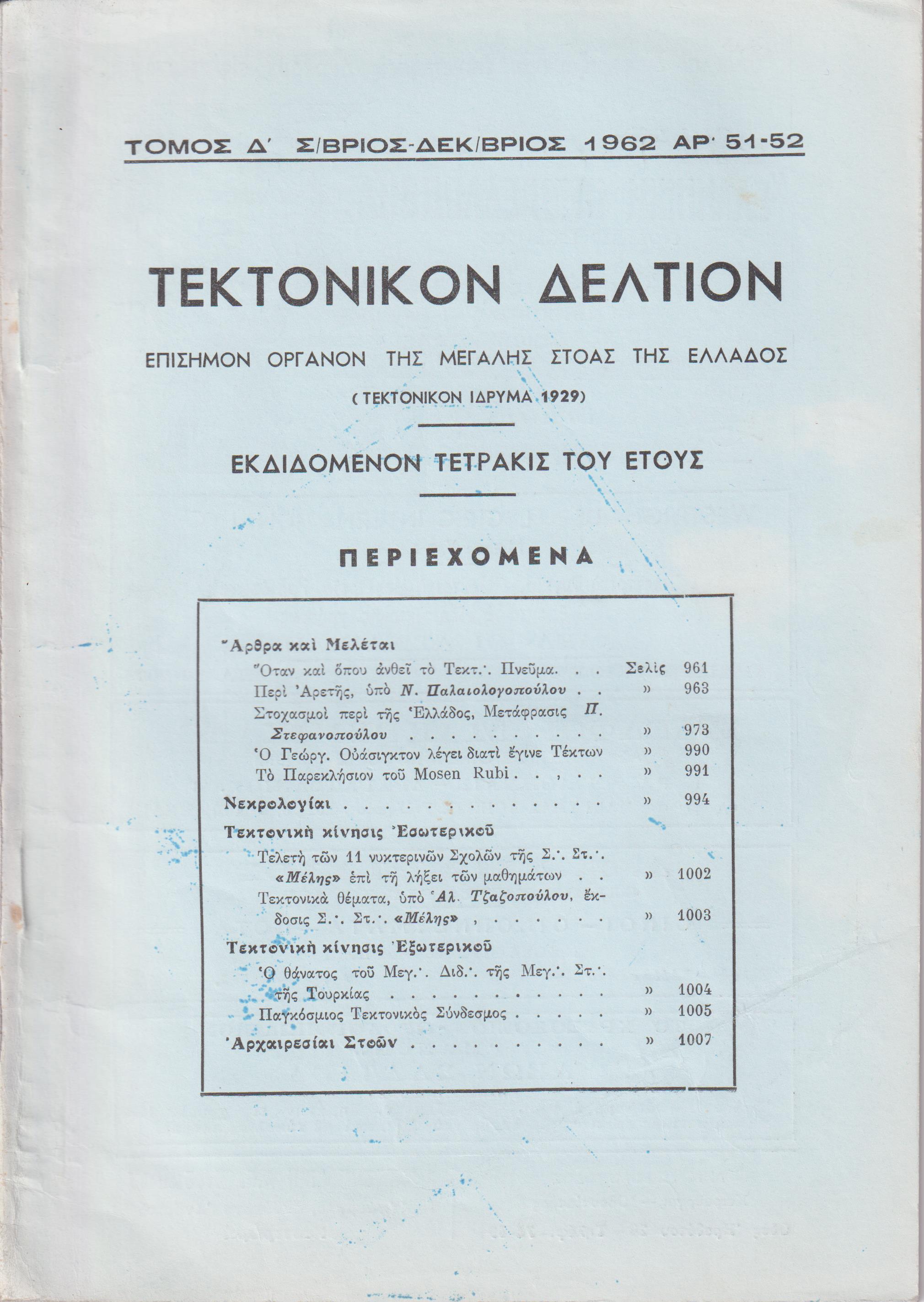 ΤΕΚΤΟΝΙΚΟΝ ΔΕΛΤΙΟΝ, Τόμος Δ΄, 1962, Επίσημον Όργανον της Μεγάλης Στοάς της Ελλάδος (Τεκτονικόν ΄Ιδρυμα 1929), εκδίδεται τετράκις του έτους. Υπεύθυνος Συντάκτης: Π. ΧΑΤΖΗΠΕΤΡΟΣ. Επιτροπή ΄Υλης: Ν. ΜΑΛΑΓΑΡΔΗΣ, Ν. ΠΑΛΑΙΟΛΟΓΟΠΟΥΛΟΣ, Π. ΣΤΕΦΑΝΟΠΟΥΛΟΣ, Α. Γ. ΜΑΡΑΤΟΣ, αρ. 49 [Μάρτιος 1962, σ. 897-928], αρ. 50[Ιούνιος 1962, σ. 929-960], αρ. 51-52[Σ/βριος-Δεκ/βριος 1962, σ. 961-1016], ΠΛΗΡΕΣ ΕΤΟΣ. Σύνολον 3 τεύχη με τα εξώφυλλά τους, το ένα διπλό.