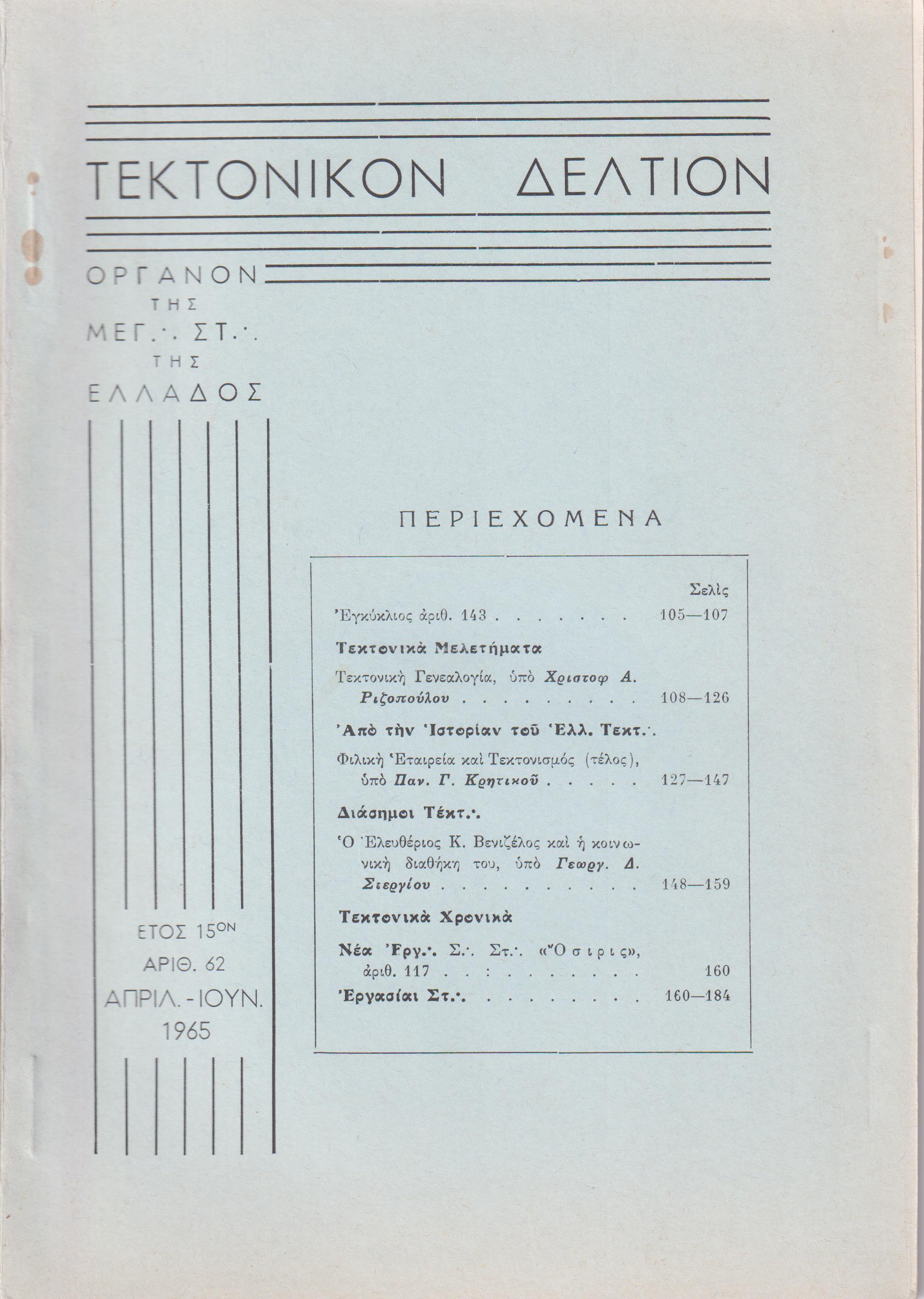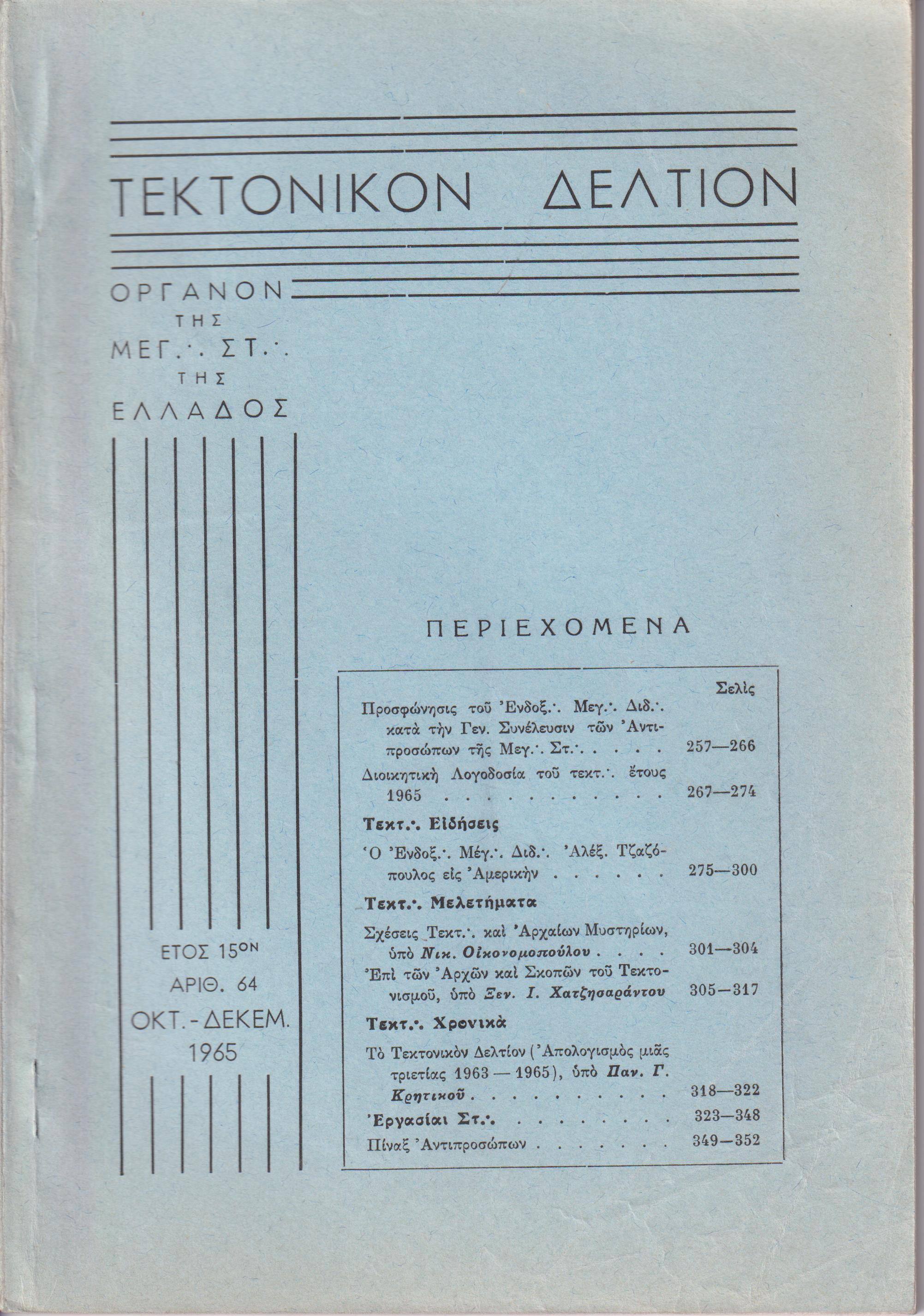 ΤΕΚΤΟΝΙΚΟΝ ΔΕΛΤΙΟΝ, 1965, έτος 15ον,΄Οργανον της Μεγάλης Στοάς της Ελλάδος