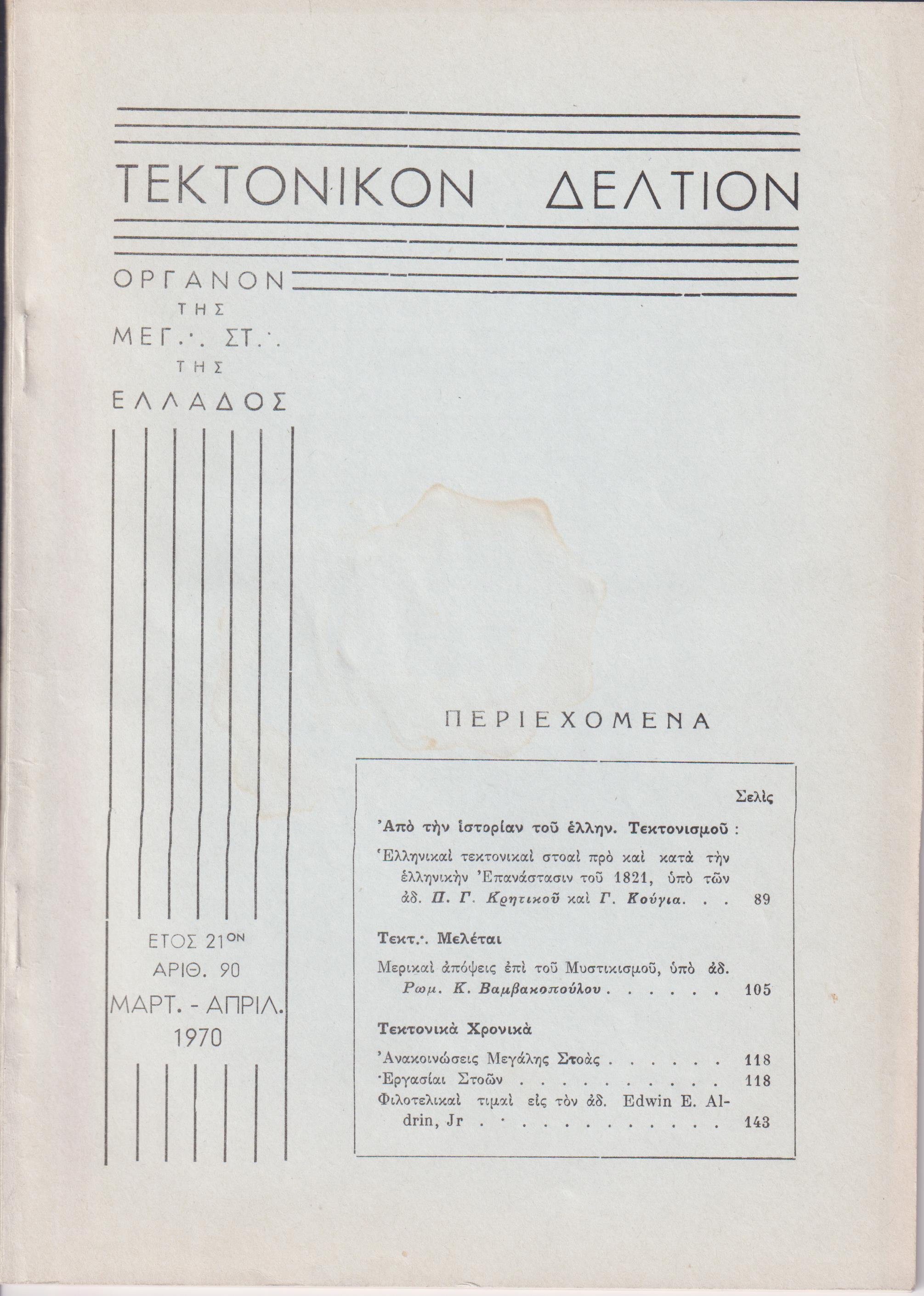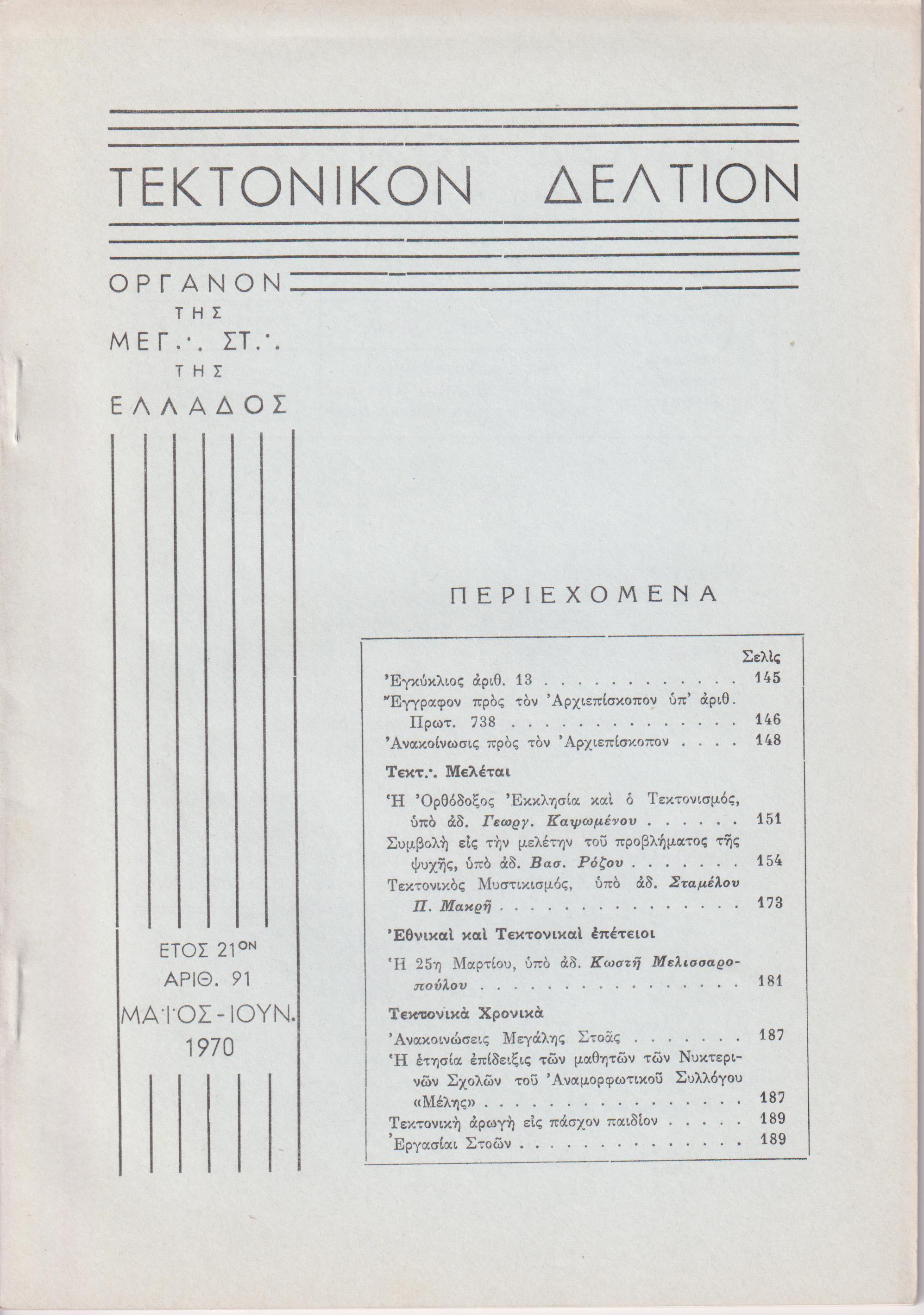 ΤΕΚΤΟΝΙΚΟΝ ΔΕΛΤΙΟΝ, 1970, έτος 21ον, ΄Οργανον της Μεγάλης Στοάς της Ελλάδος