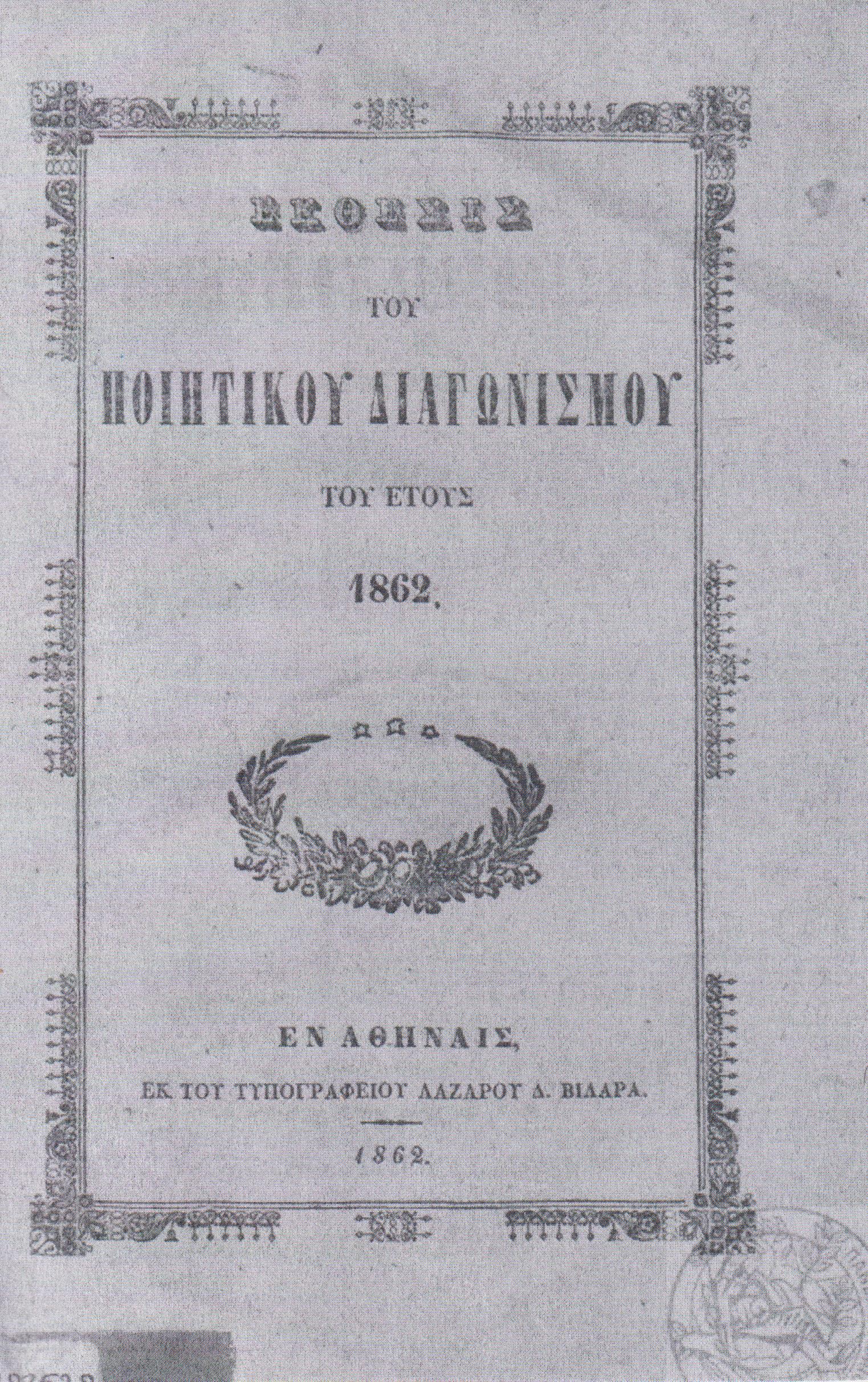 ΕΚΘΕΣΙΣ του Ποιητικού Διαγωνισμού του έτους 1862. Εν Αθήναις, ΕΚ ΤΟΥ ΤΥΠΟΓΡΑΦΕΙΟΥ ΛΑΖΑΡΟΥ Δ. ΒΙΛΑΡΑ, 1862, 8ο, σελ. 32 (αντίτυπο ταλαιπωρημένο, λυτό, λείπουν: εξώφυλλο και σελίδα τίτλου, σε αντίγραφα, ΓΚΙΝΗΣ-ΜΕΞΑΣ αρ. 1862.152 & ΓΚΙΝΗΣ-ΜΕΞΑΣ αρ. 9063)