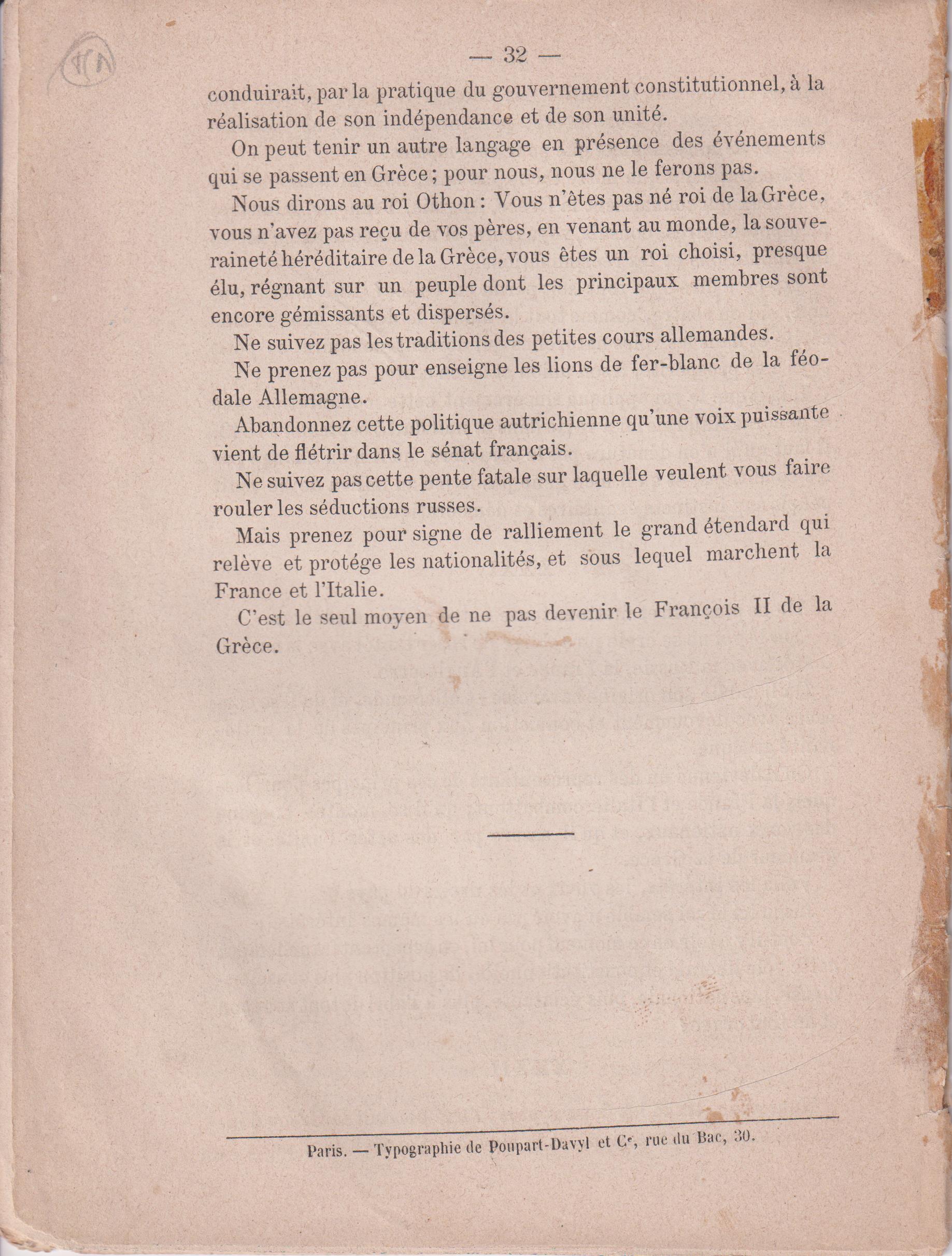 La Grèce et le Roi Othon devant l' Europe. Etude sur l' état actuel du Royaume de Grèce. Paris 1862, 8ο , σελ. 32 (αντίτυπο λυτό, χωρίς εξώφυλλο)