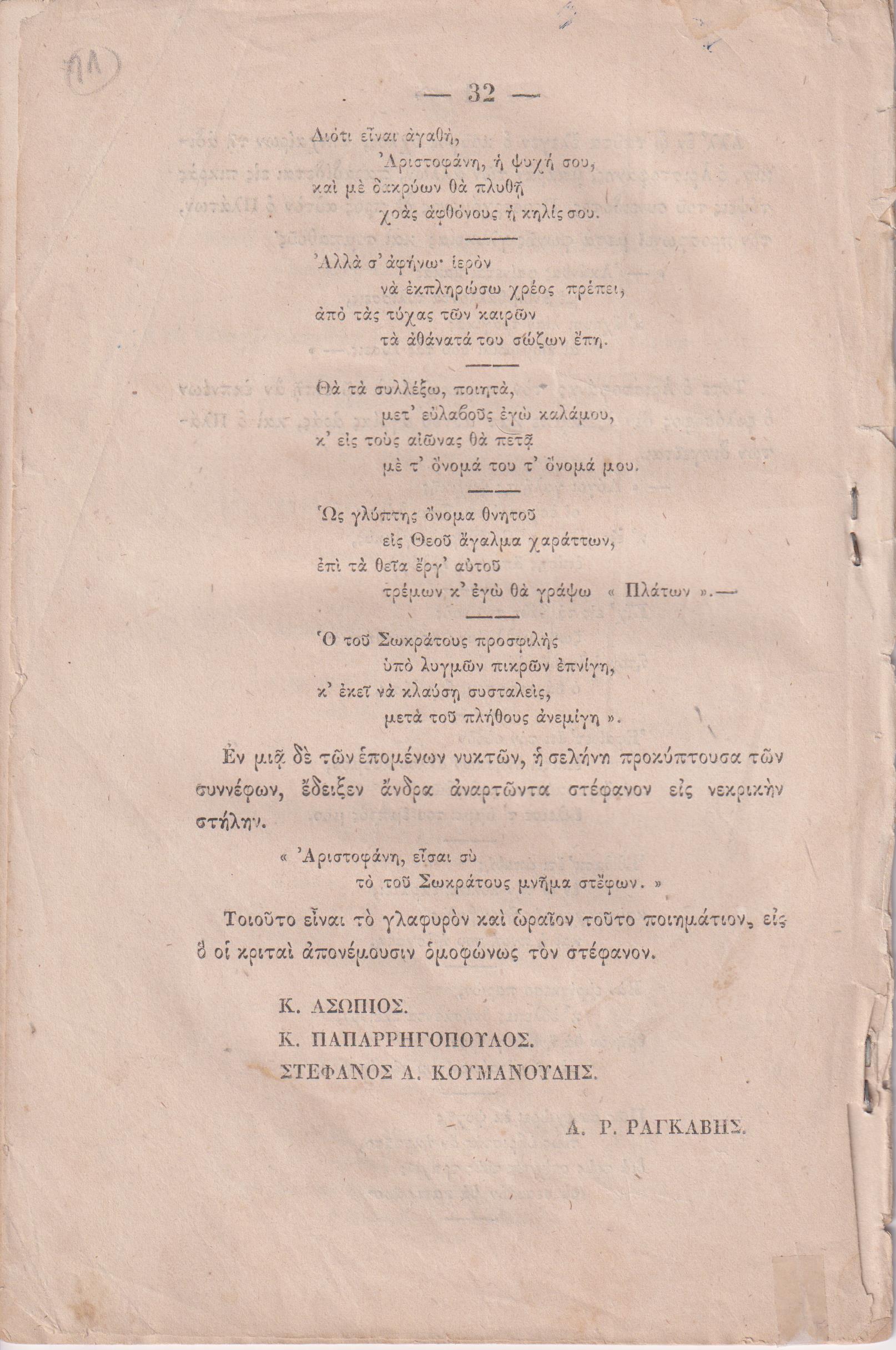 ΕΚΘΕΣΙΣ του Ποιητικού Διαγωνισμού του έτους 1862. Εν Αθήναις, ΕΚ ΤΟΥ ΤΥΠΟΓΡΑΦΕΙΟΥ ΛΑΖΑΡΟΥ Δ. ΒΙΛΑΡΑ, 1862, 8ο, σελ. 32 (αντίτυπο ταλαιπωρημένο, λυτό, λείπουν: εξώφυλλο και σελίδα τίτλου, σε αντίγραφα, ΓΚΙΝΗΣ-ΜΕΞΑΣ αρ. 1862.152 & ΓΚΙΝΗΣ-ΜΕΞΑΣ αρ. 9063)