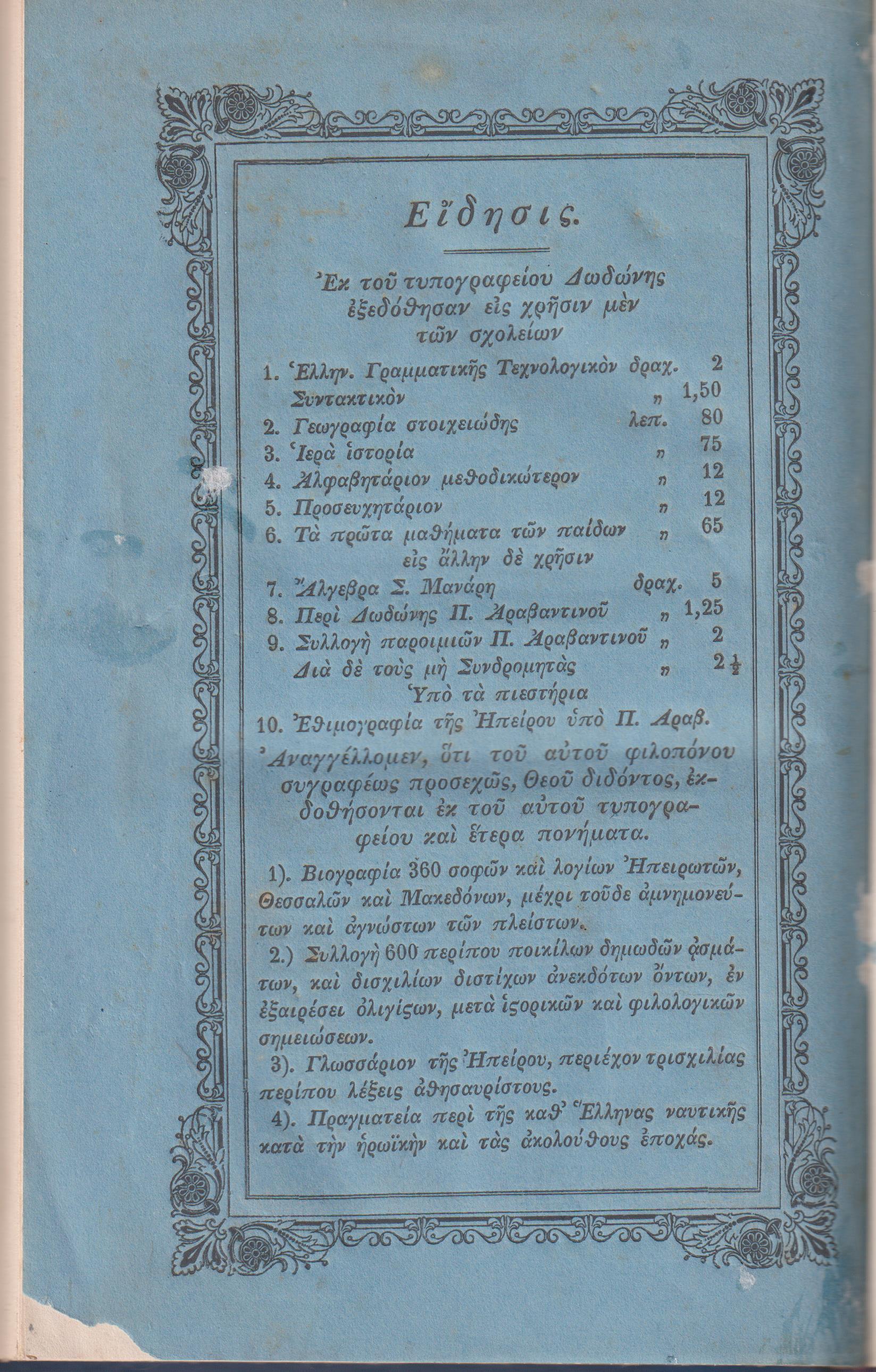 ΑΡΑΒΑΝΤΙΝΟΣ Π.,  Παροιμιαστήριον ή συλλογή παροιμιών εν χρήσει ουσών παρά τοίς Ηπειρώταις, μετ’ αναπτύξεως της εννοίας αυτών και παραλληλισμού προς τας αρχαίας. Εν Ιωαννίνοις, ΤΥΠΟΙΣ ΔΩΔΩΝΗΣ, 1863, 8o, σελ. ιά+1λ+[15]-183+1λ (αντίτυπο σε αρίστη κατάσταση, νεότερη βιβλιοδεσία με τα εξώφυλλα, δερμάτινη ράχη,  χρώμα μπλε, ΗΛΙΟΥ- ΠΟΛΕΜΗ αρ. 1863.447)