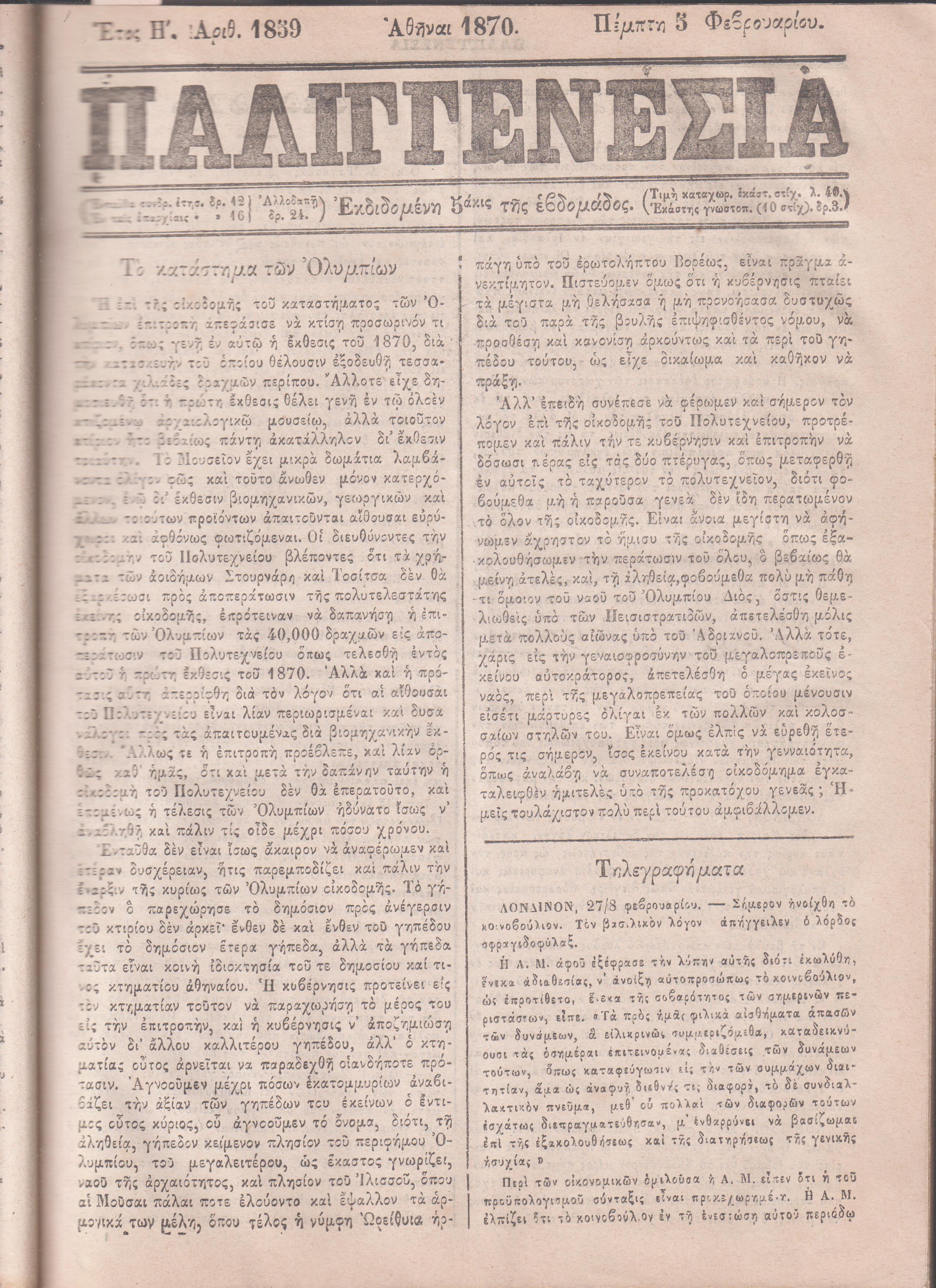 ΠΑΛΙΓΓΕΝΕΣΙΑ 1870, έτος Η΄+Θ΄, Εκδιδομένη 5άκις της εβδομάδος. Ο εκδότης ΙΩ. ΑΓΓΕΛΟΠΟΥΛΟΣ. Αθήναι, Τύποις ΙΩ. ΑΓΓΕΛΟΠΟΥΛΟΥ, 4ο [21Χ29,5εκ.], 4σέλιδα[τεύχη] φύλλα, (Διαθέτουμε τα φύλλα: ΄Ετος Η΄, αρ. 1835[Πέμπτη 1 Ιανουαρίου 1870, σελ. 4] έως αρ. 1837[Σάββατον 3 Ιανουαρίου 1870, σελ. 2, λείπουν οι σελ. 3-4], λείπουν τα φύλλα αρ. 1838-1845 και από αρ. 1846[Σάββατον 17 Ιανουαρίου 1870, σελ. 4] έως αρ. 2038[[Δευτέρα 19 Οκτωβρίου 1870, σελ.4], & έτος Θ΄, αρ. 2039[Τρίτη 20 Οκτωβρίου 1870, σελ. 4)], έως αρ. 2088[Τρίτη 29 Δεκεμβρίου 1870, σελ. 4] + φύλλο ΔΕΥΤΕΡΑ ΕΚΔΟΣΙΣ, σελ. 4). ΄Όλα τα φύλλα δεμένα σε ένα τόμο, και σε αρκετά καλή κατάσταση. Η βιβλιοδεσία εποχής ταλαιπωρημένη, αποκολλημένη η ράχη και το μπροστινό καπάκι από το σώμα, το οποίο είναι πολύ ξακρισμένο κυρίως στο επάνω μέρος και σε αρκετά τεύχη(φύλλα) επηρεάζει την πρώτη γραμμή με τις χρονολογίες & ημερομηνίες. Εκτός βιβλιοδεσίας τα πρώτα 3 τεύχη αρκετά ταλαιπωρημένα . Σύνολον 244 φύλλα
