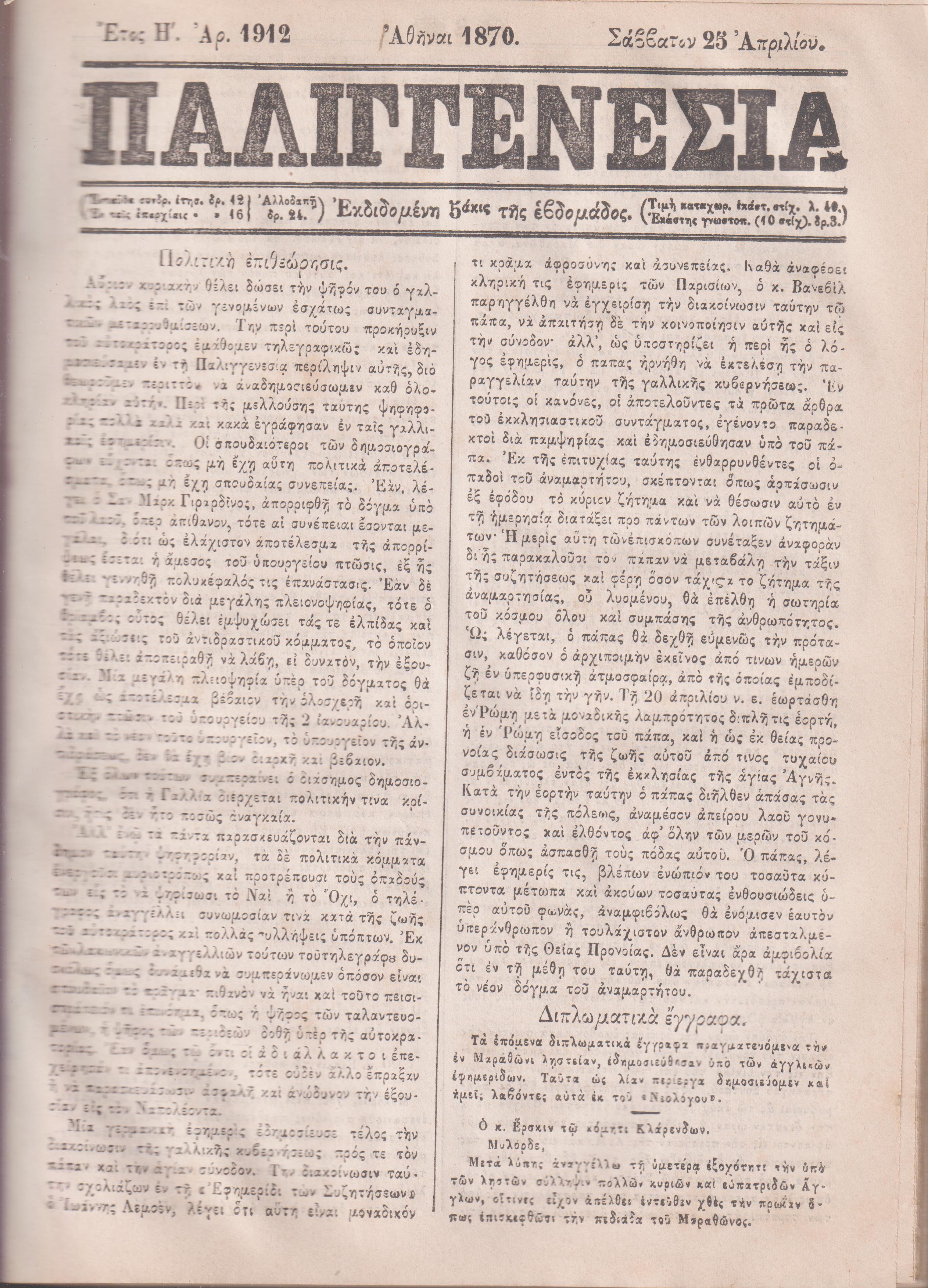 ΠΑΛΙΓΓΕΝΕΣΙΑ 1870, έτος Η΄+Θ΄, Εκδιδομένη 5άκις της εβδομάδος