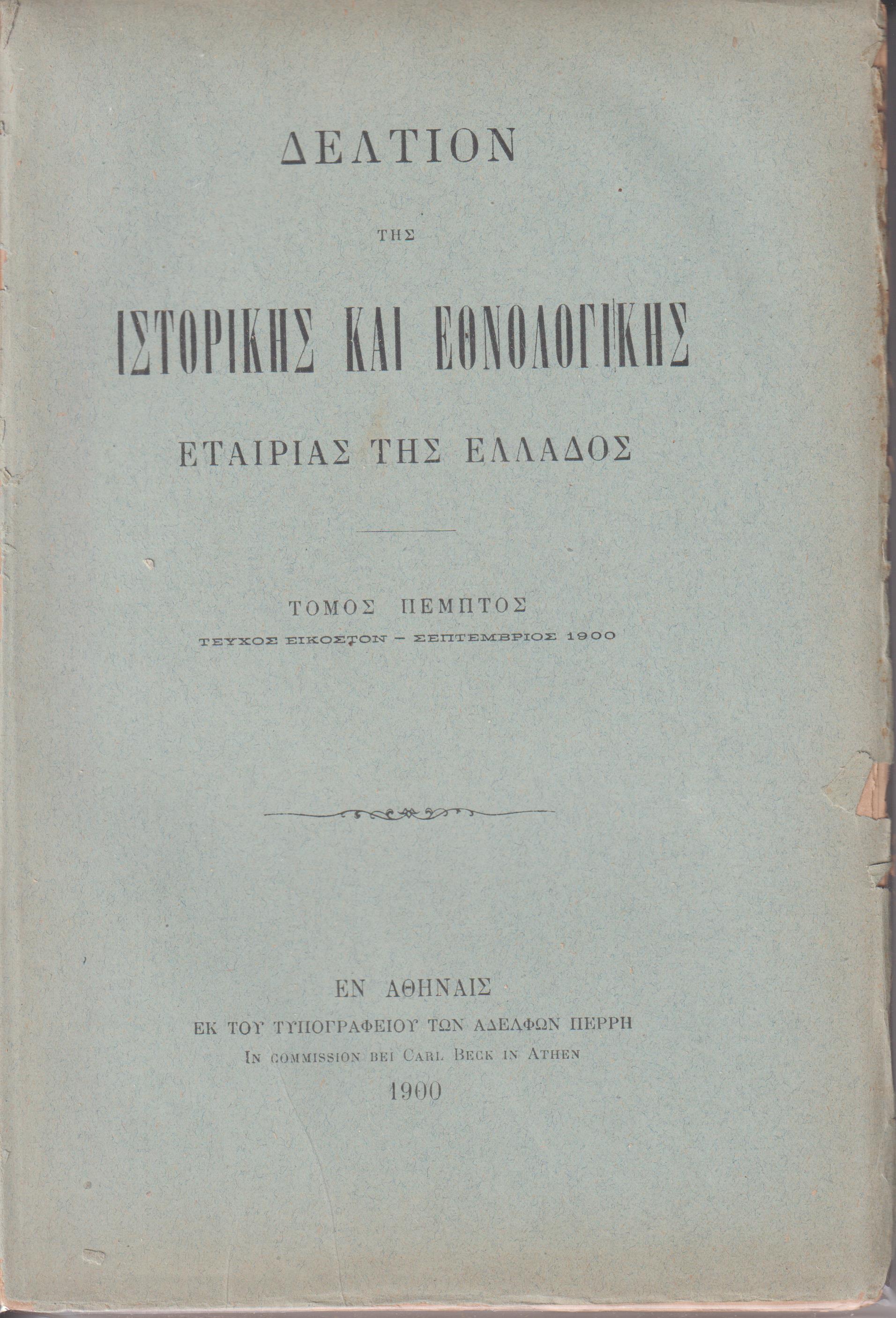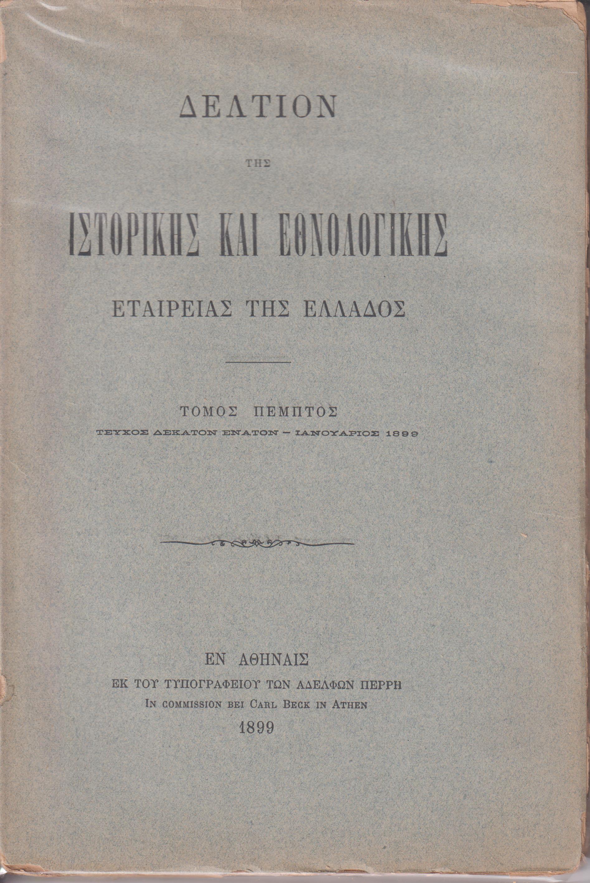 ΔΕΛΤΙΟΝ ΤΗΣ ΙΣΤΟΡΙΚΗΣ ΚΑΙ ΕΘΝΟΛΟΓΙΚΗΣ ΕΤΑΙΡΙΑΣ ΤΗΣ ΕΛΛΑΔΟΣ, Τόμος Ε΄, σε τεύχη (1ο[17ο], 2ο[18ο], 3ο[19ο], 4ο[20ο]) πλήρης τόμος άδετος. Εν Αθήναις 1896, 8o, σελ. 828 + ΙΒ΄ πίνακες εκτός κειμένου (από τα περιεχόμενα: ΑΔΑΜΑΝΤΙΟΥ ΑΔΑΜ., Τηνιακά, σ. 277-326. – ΑΛΕΞΟΥΔΗ ΑΝΘΙΜΟΥ, Κατάλογος των εν ταις ιεραίς εκκλησίαις της συνοικίας Κάστρου, πόλεως Βερατίου της Μητροπόλεως Βελεγρλαδων ευρισκομένων αρχαίων χειριγράφων, σ. 352-369. – ΔΑΣΣΑΡΗΤΟΥ ΗΛΙΑ, Περί της Κοριτσάς, σ. 123-158. – ΔΙΑΜΑΝΤΑΡΑ Α., Ολίγα περί της εν Μεγίστη Μονής του Αγ. Γεωργίου, σ. 252-258. – ΖΩΗ Λ. Χ., Ιστορικαί σελίδες εκ της Ελληνικής Επαναστάσεως, σ. 259-262. – ΛΑΜΠΡΟΥ ΣΠΥΡ. Π., Γεωργίου του Αιτωλού Μύθοι, νυν το πρώτον εκδιδόμενοι, σ. 1-102. - του ιδίου: Αγιορειτικά απόγραφα του Σπανέα, νυν το πρώτον εκδιδόμενοι, σ. 103-122. - του ιδίου: Ταβουλλαρικόν γράμμα του ΙΔ΄αιώνος, σ. 159-160. - του ιδίου: Δύο εκθέσεις περί Αθηνών περί τα τέλη του 17ου αιώνος, σ. 219-227. - του ιδίου: Η περί Πελοποννήσου έκθεσις του Βενετού Προνοητού Γραδενίγου, σ. 228-251. - του ιδίου: Εκθέσεις των Βενετών Προνοητών της Πελοποννήσου εκ των εν Βενετία αρχείων, σ. 425-567 & 605-823, - του ιδίου: Ενετίησι= εν έτει, σ. 572. – ΜΕΝΑΡΔΟΥ ΣΙΜΟΥ, Κυπριώτικα τραγούδια, σ. 277-326. – ΚΩΝΣΤΑΝΤΙΝΙΔΟΥ Γ., Δύο ιστορικά έγγραφα σχετικά προς την ιστορίαν των Αθηνών επί της καταλανοκρατίας, σ. 824-827. – ΚΩΣΤΗ Ν. Κ. Χ., Ανέκδοτοι επιστολαί Κοραή και προς Κοραήν, σ. 263-276. – ΣΑΡΡΟΥ Δ. Μ., Λείψανα της λατρείας του Λίνου και Αδώνιδος εν Ηπείρω, σ. 347-351, του ιδίου: Χρονογραφικά σημειώματα αναφερόμενα εις την νεωτέραν ιστορίαν της Ηπείρου και της ηγεμονίας της Βλαχίας, εξ ανεκδότου συλλογής, σ. 568-571. ΤΡΟΫ ΜΑΞ, Περί Ευθυμίου Νέων Πατρών του Μαλάκη, σ. 196-218. – ΦΙΛΗΤΑ Χ., Περί του συνοικισμού των Γραικών εν Τεργέστη, σ. 370-376. – ΙΣΤΟΡΙΚΗ ΚΑΙ ΕΘΝΟΛΟΓΙΚΗ ΕΤΑΙΡΙΑ ΤΗΣ ΕΛΛΑΔΟΣ, Πρακτικά της ΙΣΤ΄ Γενικής Συνόδου της 19 Μαΐου 1896, σ. 161-196. – ΙΕΕΕ, Πρακτικά της ΙΖ΄ Γενικής Συνόδου της 3 Μαΐου 1898, σ. 377-424. – ΙΕΕΕ, Πρακτικά της ΙΗ΄ Γενικής Συνελεύσεως των Εταίρων της 23 Μαΐου 1899, σ. 573-604). Τα 4 τεύχη άδετα, λυτά, άκοπα φύλλα, ταλιπωρημένο το 1ο τεύχος