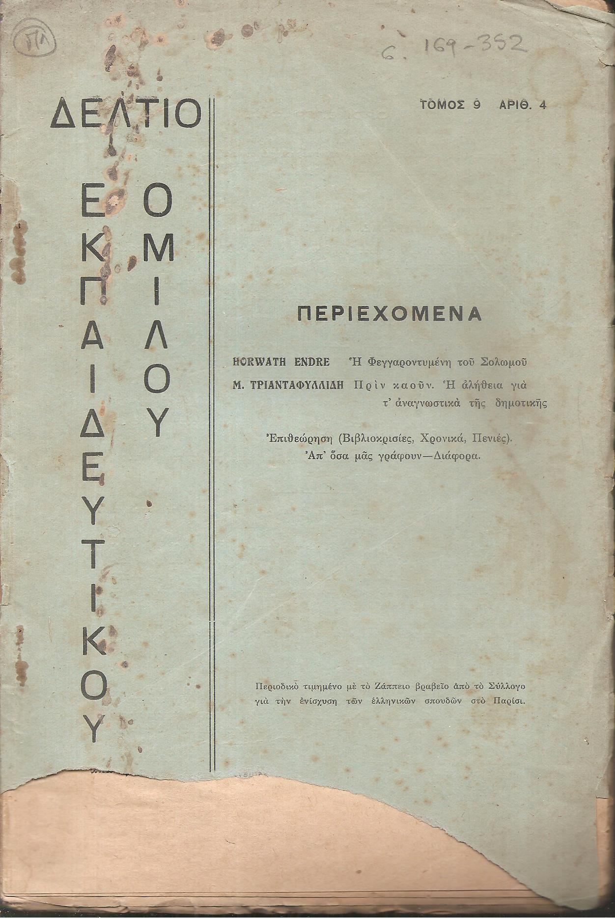 ΔΕΛΤΙΟ ΤΟΥ ΕΚΠΑΙΔΕΥΤΙΚΟΥ ΟΜΙΛΟΥ , τόμος 9ος(1921), τεύχη αρ. 1-3 & 4 . Αθήνα 1921, 8ο, σελ. 168+169-352 ( Περιεχόμενα τεύχους με αρ. 1-3 : ΤΡΙΑΝΤΑΦΥΛΛΙΔΗ Μ., Δέκα χρόνια.- ΓΙΑΝΙΔΗ ΕΛΙΣΑΙΟΥ, Η βυζαντινή μουσική και η εναρμόνισή της.- ΘΡΑΚΙΑ ΧΡΙΣΤΟΥ, Stefan George, ο λυρικός ποιητής.- ΤΡΙΑΝΤΑΦΥΛΛΙΔΗ Μ., Γιά την ιστορία.- Δ. Φ., Παιδεία και πολιτική .- ΠΑΛΑΜΑ ΛΕΑΝΔΡΟΥ, ΄Ιων Δραγούμης .- Επιθεώρηση(Βιβλιοκρισίες, Χρονικά, Πενιές).- Απ’όσα μας γράφουν.- Διάφορα. Περιεχόμενα τεύχους με αρ. 4 : ENDRE HORWATH, Η Φεγγαροντυμένη του Σολωμού .- ΤΡΙΑΝΤΑΦΥΛΛΙΔΗ Μ., Πριν καούν. Η αλήθεια γιά τ’αναγνωστικά της δημοτικής .- Επιθεώρηση(Βιβλιοκρισίες, Χρονικά, Πενιές).- Απ’όσα μας γράφουν.- Διάφορα ). Οι αρ. 1-3 & 4 σε δύο τεύχη άδετα, ΠΛΗΡΗΣ ΤΟΜΟΣ