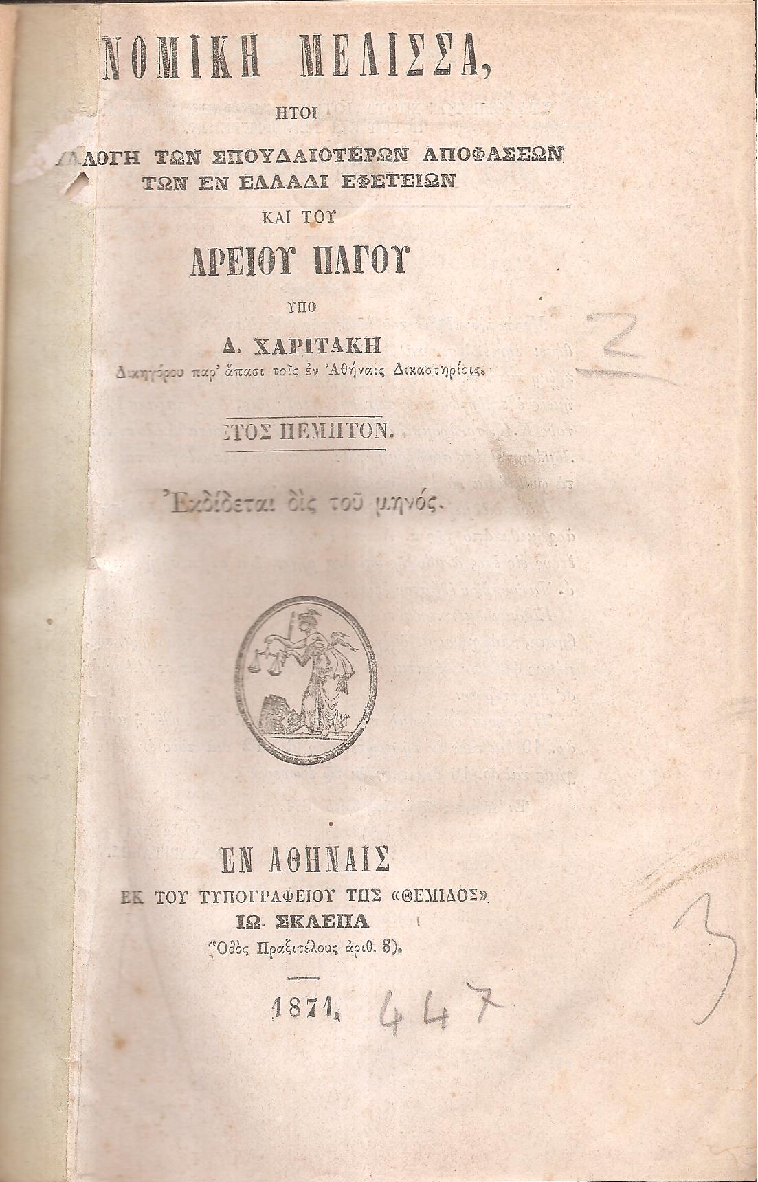 ΝΟΜΙΚΗ ΜΕΛΙΣΣΑ 1870-1872, έτη Δ΄-Ε΄, ήτοι Συλλογή των σπουδαιοτέρων αποφάσεων των εν Ελλάδι