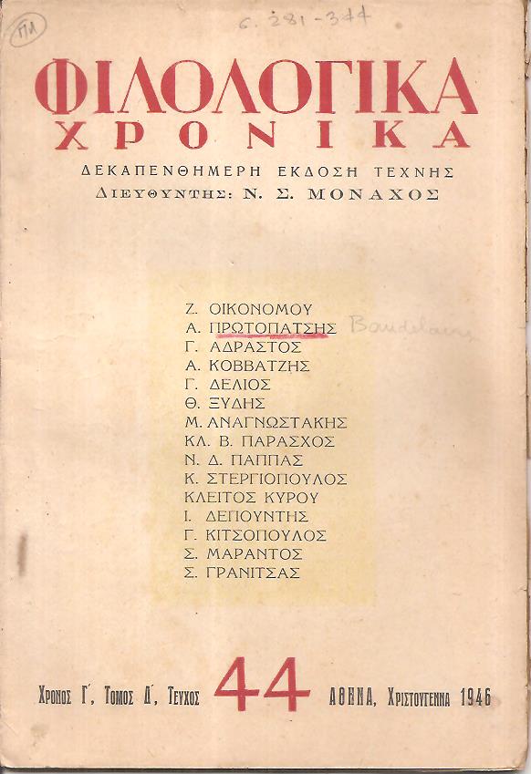 ΦΙΛΟΛΟΓΙΚΑ ΧΡΟΝΙΚΑ 1946, Χρόνος Γ΄, τόμος Δ΄. Δεκαπενθήμερη Λογοτεχνική ΄Εκδοση Τέχνης και Σκέψης . Διευθυντής : Ν. Σ. ΜΟΝΑΧΟΣ . Αθήνα 1946, 8ο , ( Τα τεύχη αρ. 37 [ Ιανουάριος 1946, σ. 64(λείπει το οπισθόφυλλο)], αρ. 42 [ 1 Ιουνίου 1946, σ. 165-216(λείπουν σελ. 183-186, 201-204, 213-216)], αρ. 43 [Ιούλιος- Αύγουστος 1946, σ. 217-280], αρ. 44 [Χριστούγεννα 1946, σ. 281-344]. Συνεργάστηκαν ή δημοσιεύουν : ΝΙΚ. ΚΑΖΑΝΤΖΑΚΗΣ, ΑΡΗΣ ΔΙΚΤΑΙΟΣ, Ε. Π. ΠΑΠΑΝΟΥΤΣΟΣ, ΝΤΙΜΗΣ ΑΠΟΣΤΟΛΟΠΟΥΛΟΣ, Θ. ΦΡΑΓΚΟΠΟΥΛΟΣ, ΓΙΩΡΓΟΣ ΣΑΒΒΙΔΗΣ, Κ.Λ. ΜΕΡΑΝΑΙΟΣ, ΚΛΕΙΤΟΣ ΚΥΡΟΥ, ΓΙΩΡΓΟΣ ΔΕΛΙΟΣ, ΜΑΝΩΛΗΣ ΑΝΑΓΝΩΣΤΑΚΗΣ, ΔΗΜ. Α. ΧΑΜΟΥΔΟΠΟΥΛΟΣ, ΠΕΤΡΟΣ ΛΥΚΙΔΗΣ, ΑΓΓΕΛΟΣ ΠΡΟΚΟΠΙΟΥ, Ι. ΚΟΡΔΑΤΟΣ, ΖΗΣΗΣ ΟΙΚΟΝΟΜΟΥ, ΝΙΚΟΣ ΓΑΒΡΙΗΛ ΠΕΝΤΖΙΚΗΣ, Γ. ΣΤΕΦΑΝΕΛΛΗΣ, ΑΣΤΕΡΗΣ ΚΟΒΒΑΤΖΗΣ, ΜΙΜΙΚΑ ΚΡΑΝΑΚΗ, Γ. ΧΑΡΑΤΣΑΡΗΣ, ΑΙΜ. ΧΟΥΡΜΟΥΖΙΟΣ, ΘΑΝΑΣΗΣ ΦΩΤΙΑΔΗΣ, ΝΙΚΟΣ ΠΑΠΠΑΣ, ΤΑΚΗΣ ΣΙΝΟΠΟΥΛΟΣ, ΑΛΚΗΣ ΑΓΓΕΛΟΓΛΟΥ, ΘΕΟΔΩΡΟΣ ΞΥΔΗΣ, ΚΛ. Β. ΠΑΡΑΣΧΟΣ, Σ. ΓΡΑΝΙΤΣΑΣ, Γ. ΑΔΡΑΣΤΟΣ κ.α. ). Σύνολον 4 τεύχη ΕΥΡΩ 20,00