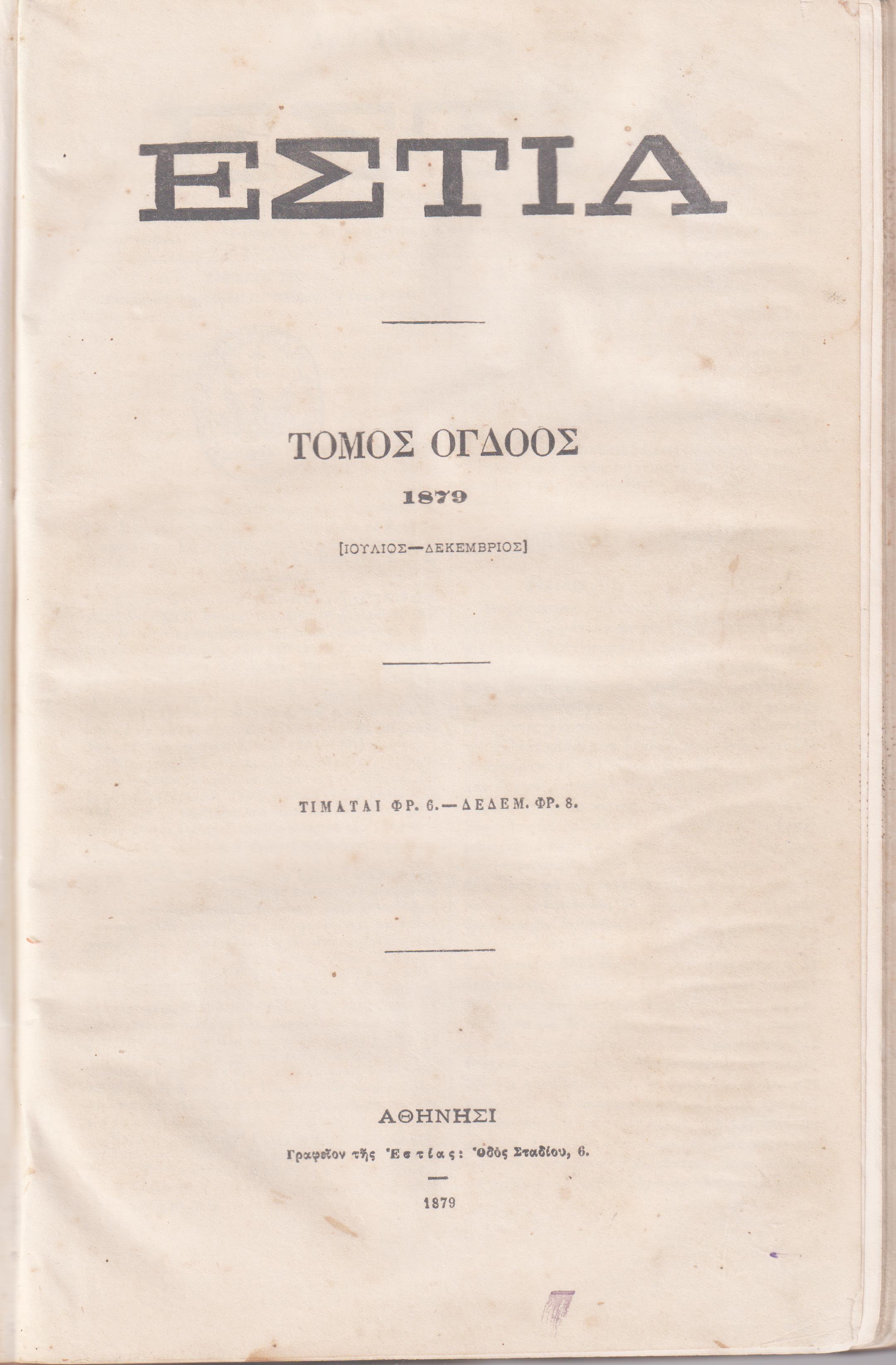 ΕΣΤΙΑ , έτος Δ΄,  τόμοι 7ος & 8ος , [Ιανουάριος – Δεκέμβριος 1879].  Εκδίδοται κατά Κυριακήν . Αθήνησι, Γραφείον της Εστίας : Οδός Σταδίου 6, 1879, 4ο, σελ. 4χ.α.+400+4χ.α.+401-832 (Τόμος 7ος ,  τεύχη αρ. 158[7 Ιανουαρίου 1879] έως αρ. 182[24 Ιουνίου 1879], τόμος 8ος , τεύχη αρ. 183 [1 Ιουλίου 1879] έως αρ. 209[30 Δεκεμβρίου 1879]. Οι δύο τόμοι δεμένοι σένα τόμο. ΠΛΗΡΕΣ  ΕΤΟΣ , χωρίς τα Δελτία . ΄Ιχνη υγρασίας και στο κείμενο και στην ταλαιπωρημένη  βιβλιοδεσία )