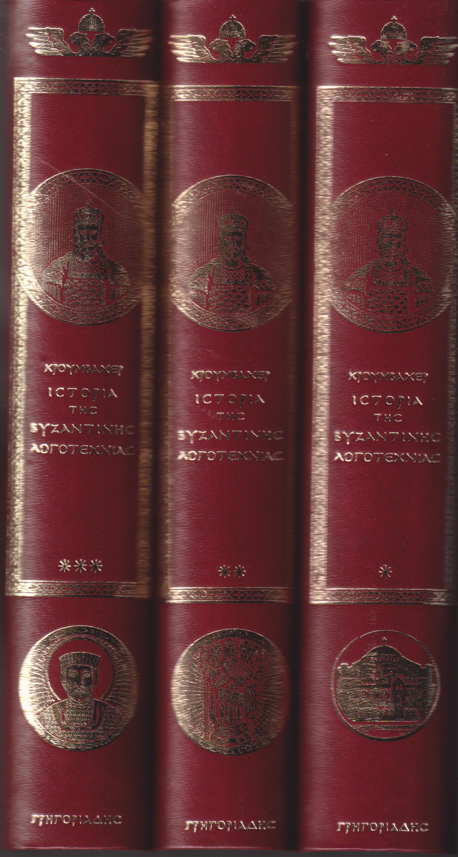 KRUMBACHER KARL., Ιστορία της Βυζαντινής λογοτεχνίας, τόμοι 1-3. Μετάφρ. Γεωργ. Σωτηριάδου. Αθήναι 1897-1900, 8o, σελ. 2491 (ΒΙΒΛΙΟΘΗΚΗ ΜΑΡΑΣΛΗ, φωτοτ.. ανατύπωση το 1974 από Εκδ. «ΓΡΗΓΟΡΙΑΔΗ» βιομηχανική βιβλιοδεσία, τ. Α΄, σελ. 61+γ΄+828, τ. Β΄, σελ. 770, τ. Γ΄, σελ. 832, με εισαγωγή, βιβλιογραφικό συμπλήρωμα & επιμέλεια : Ι. Μ. ΧΑΤΖΗΦΩΤΗ)